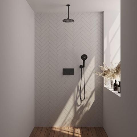 Zwart mat - Diameter hoofddouche: 30cm - Handdouche: Rond - Douchearm montage: Plafondarm - Gladde Knoppen (€ 1.407,40 )