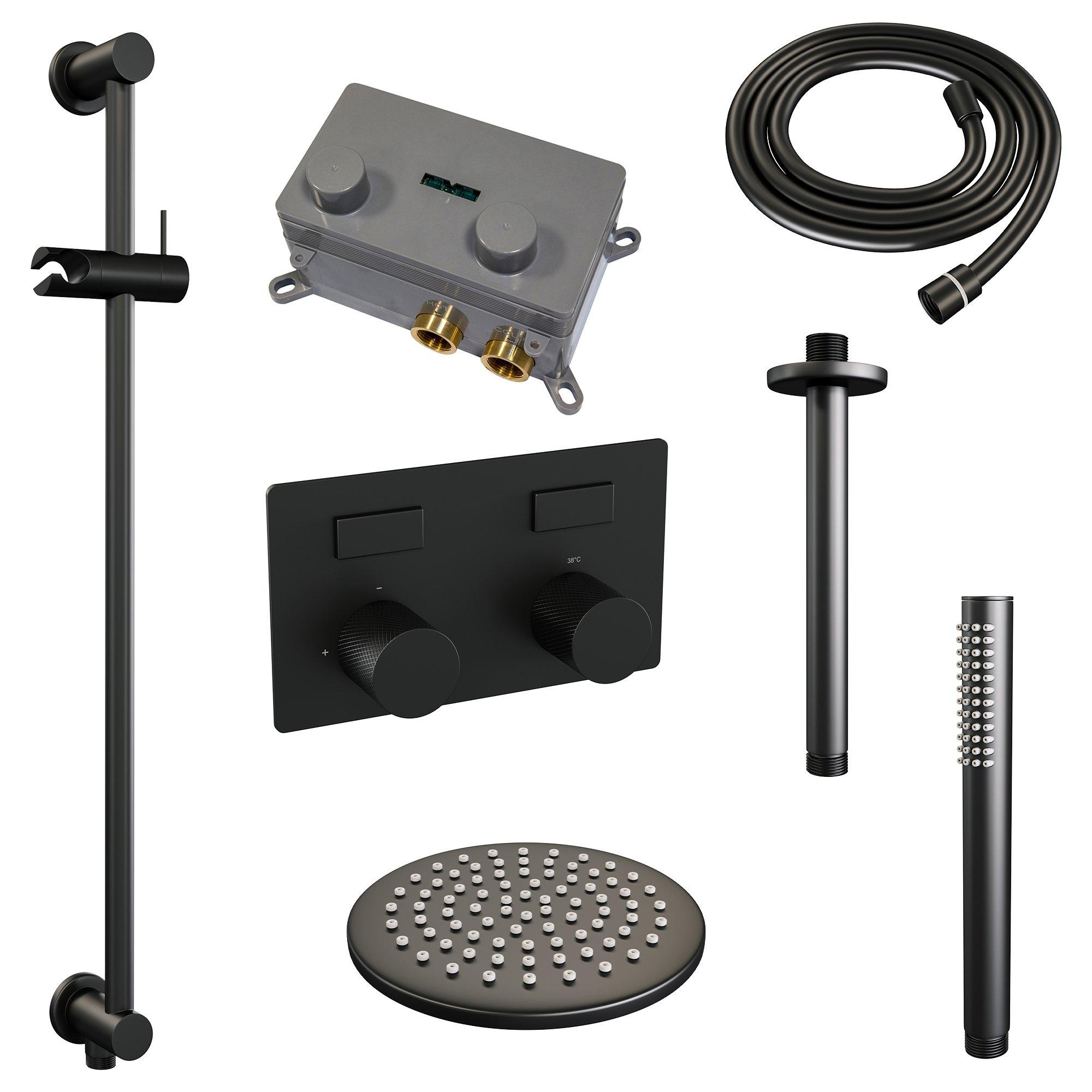 Zwart mat - Diameter hoofddouche: 30cm - Handdouche: Staaf - Douchearm montage: Plafondarm - Gladde knoppen (€ 1.488,20 )