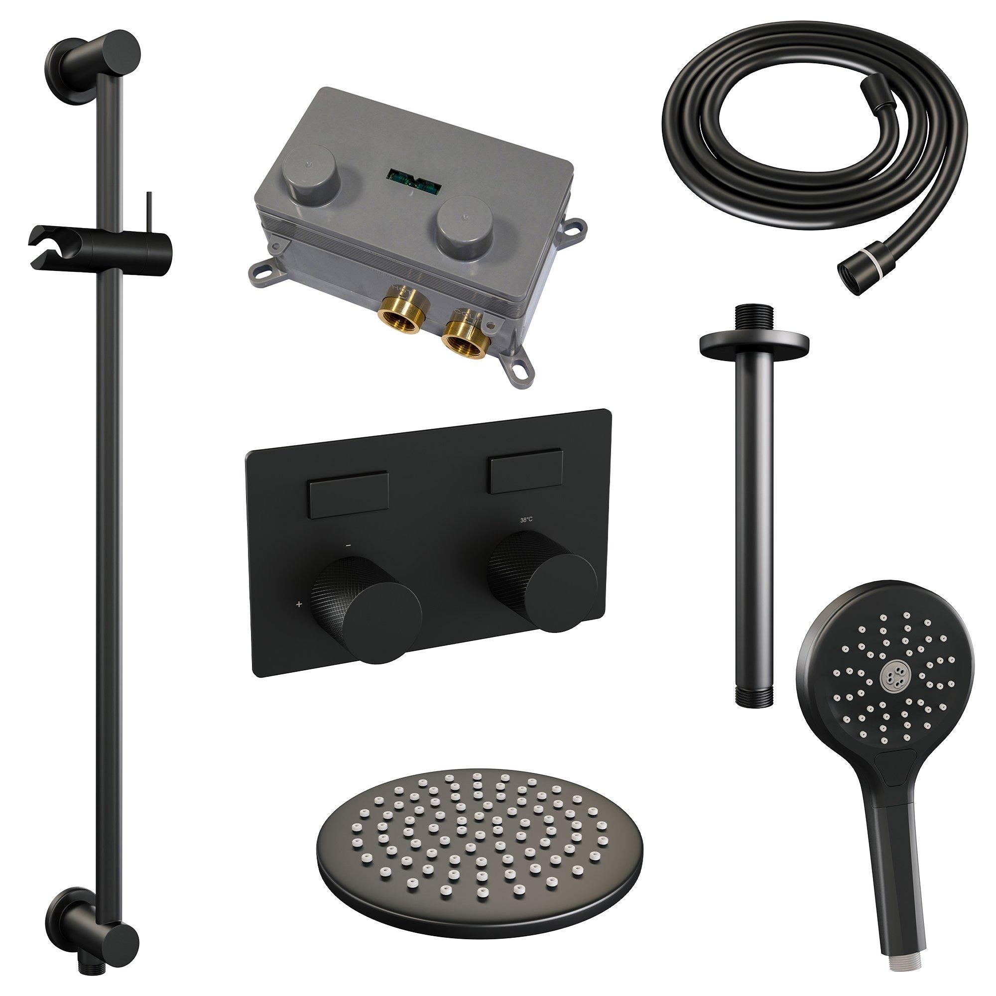 BRAUER Black Carving Thermostatische Regendouche inbouw - drukknoppen - SET 71 - 20cm hoofddouche - plafondarm - 3 standen handdouche - doucheslang - geïntegreerde glijstang - zwart mat