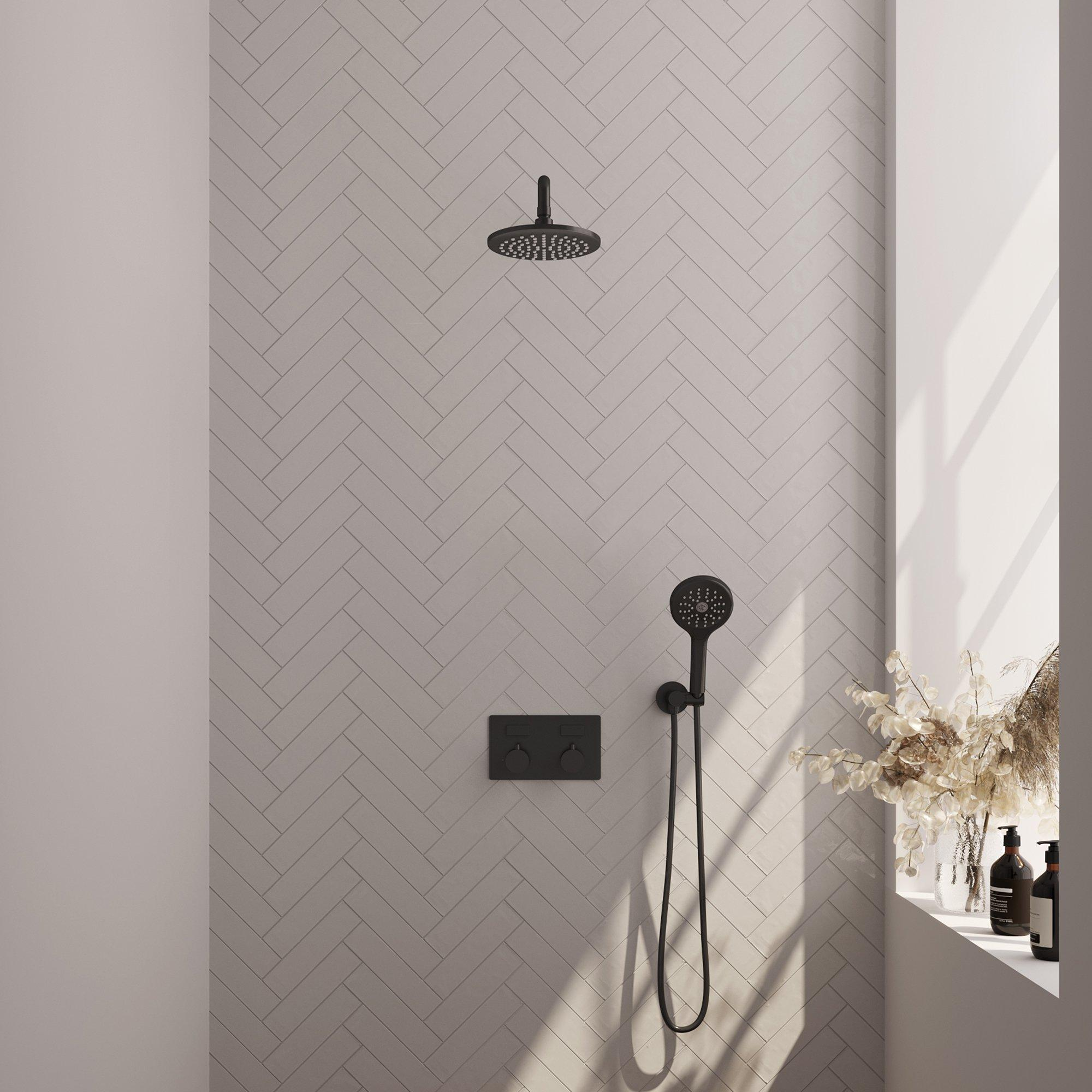 BRAUER Black Edition Thermostatische Regendouche inbouw - drukknoppen - SET 57 - 20cm hoofddouche - gebogen muurarm - 3 standen handdouche - doucheslang - wandaansluitbocht - zwart mat