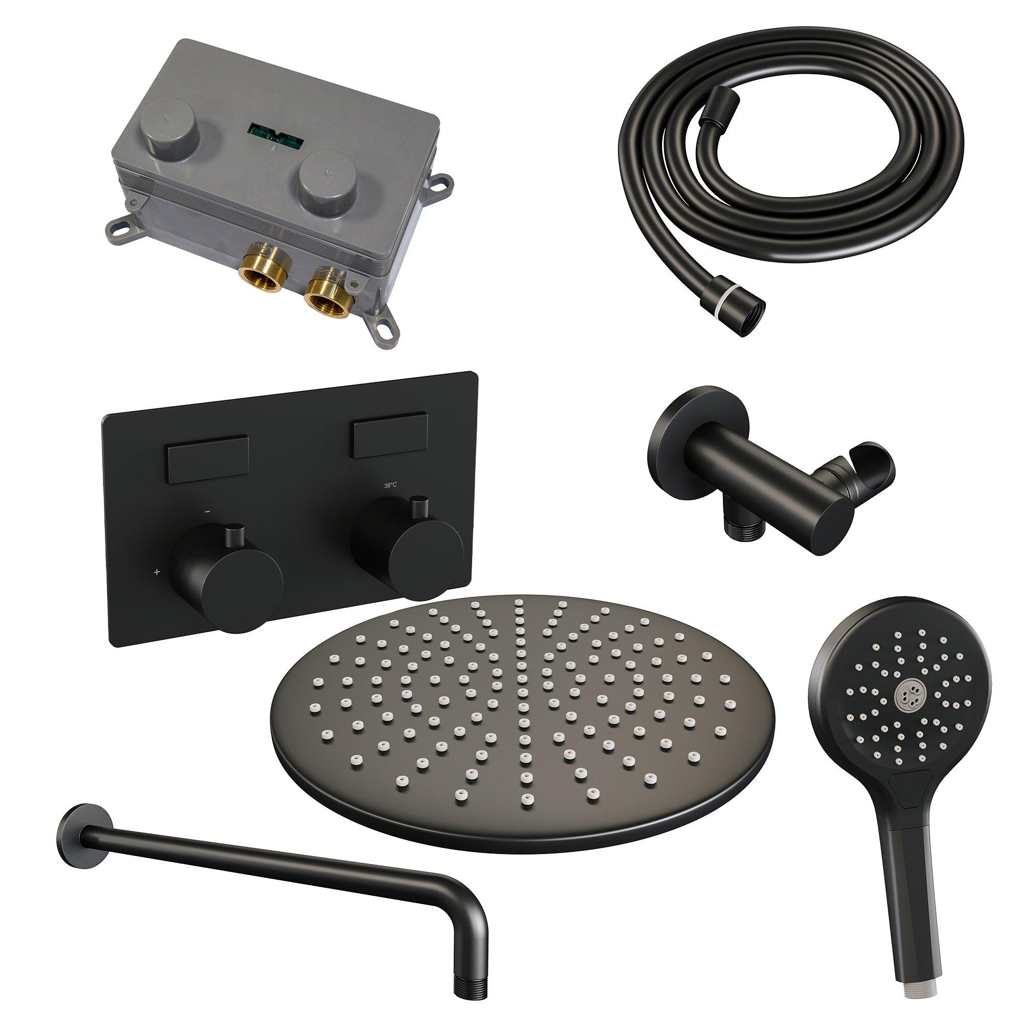 BRAUER Black Edition Thermostatische Regendouche inbouw - drukknoppen - SET 58 - 30cm hoofddouche - gebogen muurarm - 3 standen handdouche - doucheslang - wandaansluitbocht - zwart mat