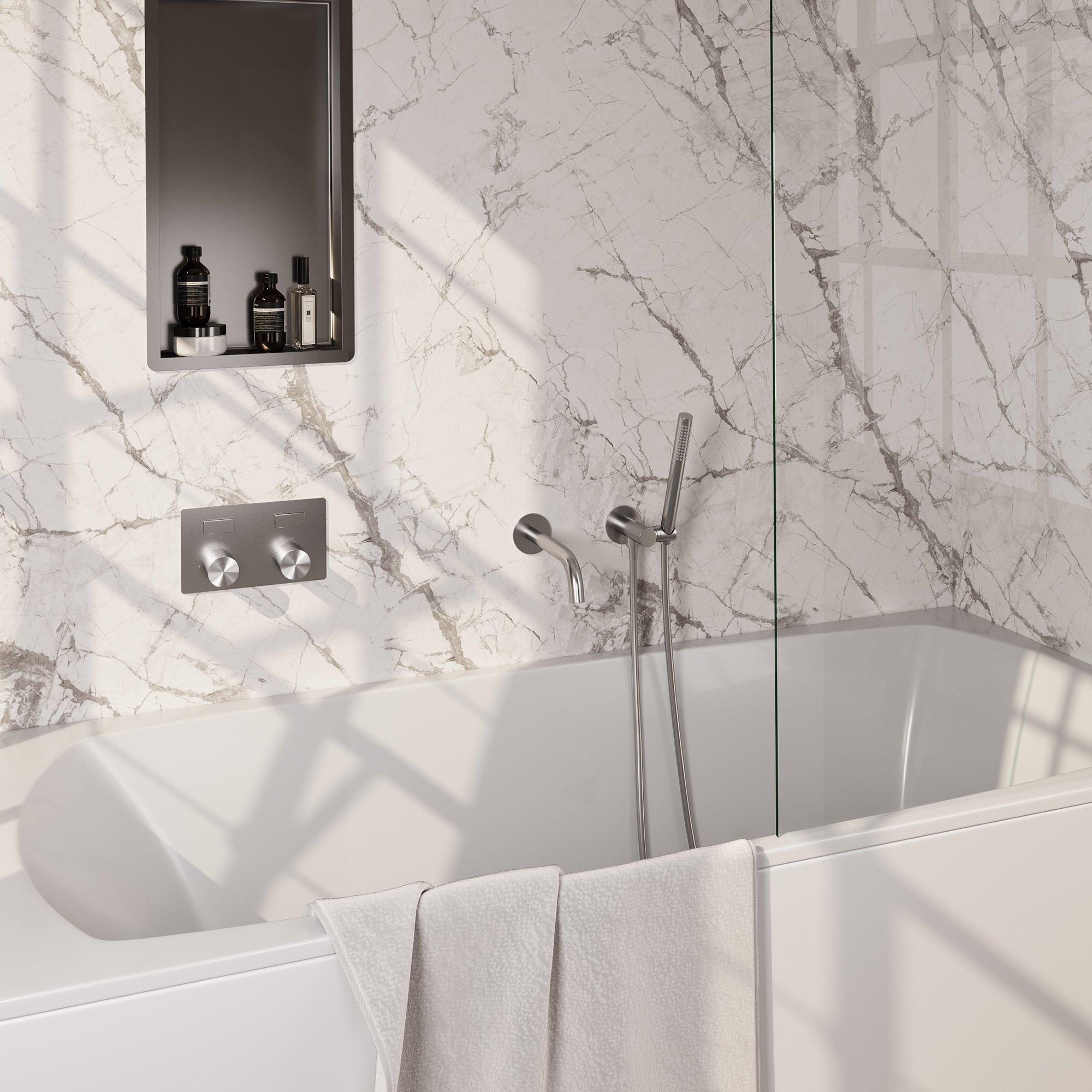 Naast zijn esthetische waarde is deze badkraan ook zeer functioneel. De thermostatische inbouw zorgt voor een efficiënte regeling van de watertemperatuur, waardoor je altijd comfortabel kunt douchen of in bad kunt gaan. De wandaansluitbocht biedt een eenvoudige installatie en de doucheslang zorgt voor flexibiliteit tijdens het gebruik. Deze set combineert design en functionaliteit op een perfecte manier.