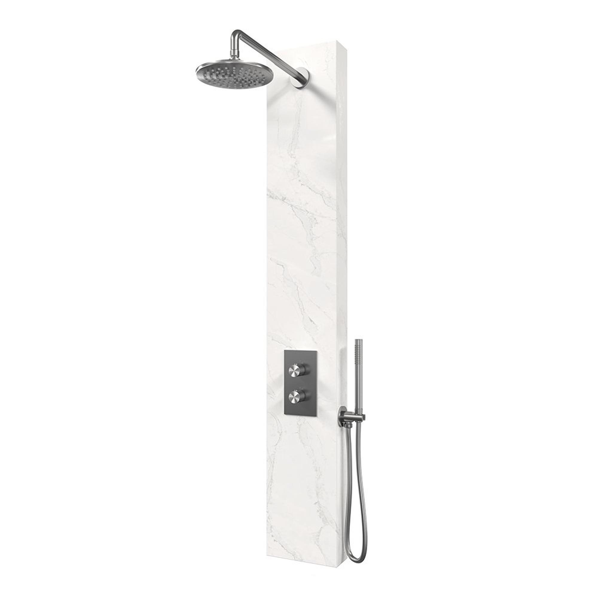 Dit douchepaneel straalt stijl en klasse uit dankzij de geborsteld RVS afwerking en het calacatta gold design. De combinatie van materialen zorgt voor een tijdloze uitstraling die perfect past in zowel moderne als klassieke badkamers. De 20cm hoofddouche en gebogen muurarm voegen een vleugje elegantie toe aan de ruimte, terwijl de staaf handdouche en wandaansluitbocht zorgen voor ultiem comfort en gemak.