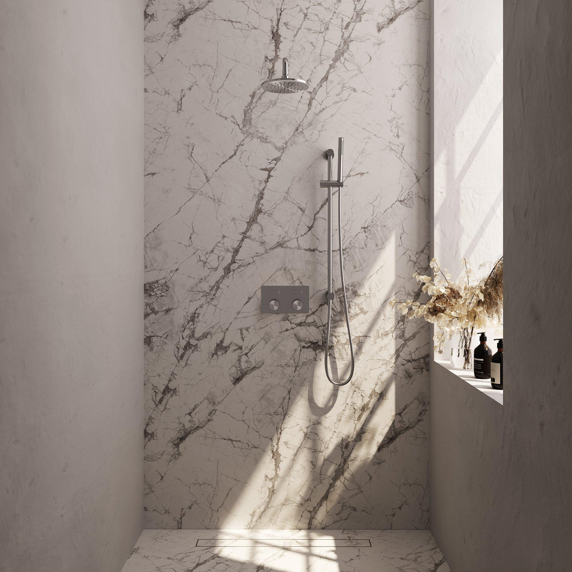 RVS geborsteld - Diameter hoofddouche: 20cm - Handdouche: Rond - Douchearm montage: Wandarm recht - Carving Knoppen (€ 1.645,30 )