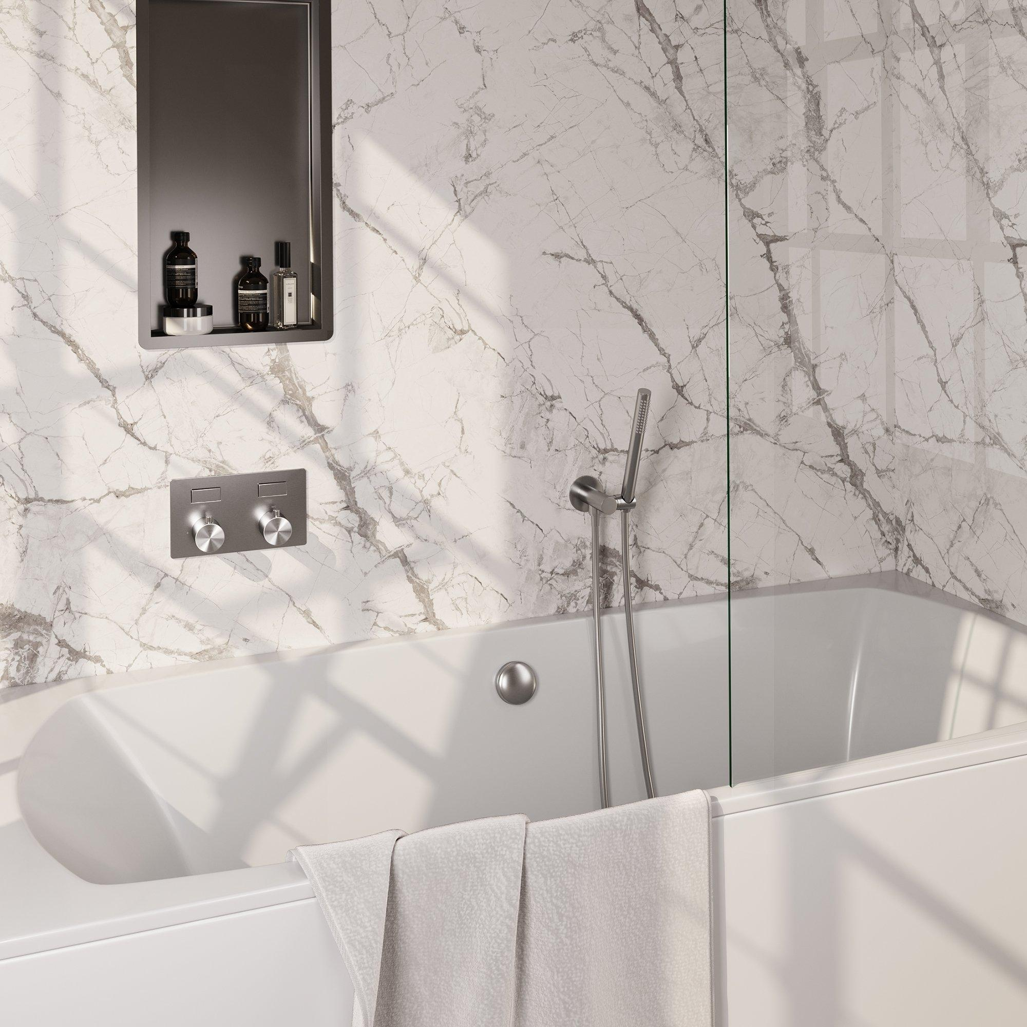 De BRAUER Brushed Edition thermostatische inbouw badkraan - drukknoppen SET 03 - badvulcombinatie - staaf handdouche - doucheslang - wandaansluitbocht - RVS geborsteld PVD is een prachtig ontworpen badkraan die functionaliteit combineert met stijl. Met zijn geborsteld roestvrijstalen afwerking voegt deze badkraan een vleugje elegantie toe aan elke badkamer. De set bevat een thermostatische inbouw badkraan met drukknoppen, een badvulcombinatie, een staaf handdouche, een doucheslang en een wandaansluitbocht, allemaal vervaardigd met hoogwaardige materialen en vakmanschap.