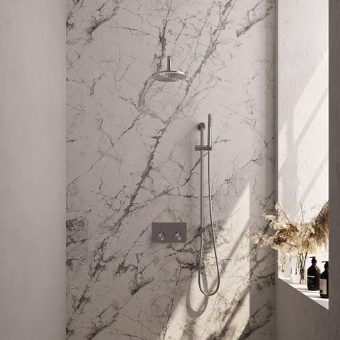 RVS geborsteld - Diameter hoofddouche: 20cm - Handdouche: Rond - Douchearm montage: Wandarm recht - Carving Knoppen (€ 1.645,30 )