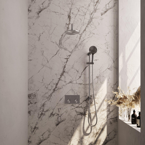 RVS geborsteld - Diameter hoofddouche: 20cm - Handdouche: Rond - Douchearm montage: Wandarm recht - Carving Knoppen (€ 1.645,30 )