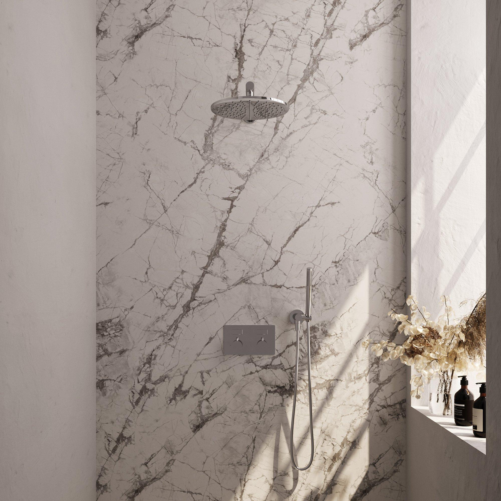 RVS geborsteld - Diameter hoofddouche: 20cm - Handdouche: Rond - Douchearm montage: Wandarm recht - Carving Knoppen (€ 1.531,30 )