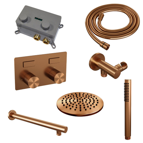 Koper geborsteld - Diameter hoofddouche: 30cm - Handdouche: Staaf - Douchearm montage: Wandarm gebogen - Gladde Knoppen (€ 1.624,90 )