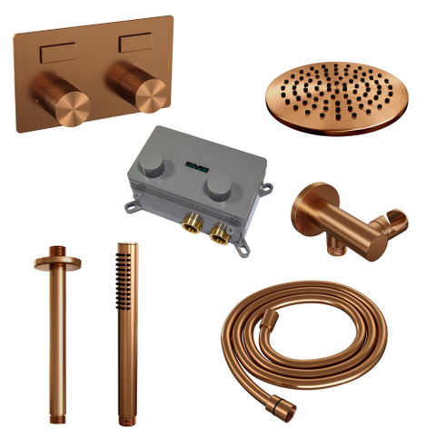 Koper geborsteld - Diameter hoofddouche: 30cm - Handdouche: Staaf - Douchearm montage: Plafondarm - Gladde Knoppen (€ 1.461,80 )