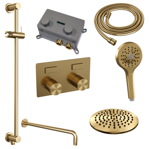 Goud geborsteld - Diameter hoofddouche: 20cm - Handdouche: Rond - Douchearm montage: Wandarm recht - Gladde knoppen (€ 1.615,30 )