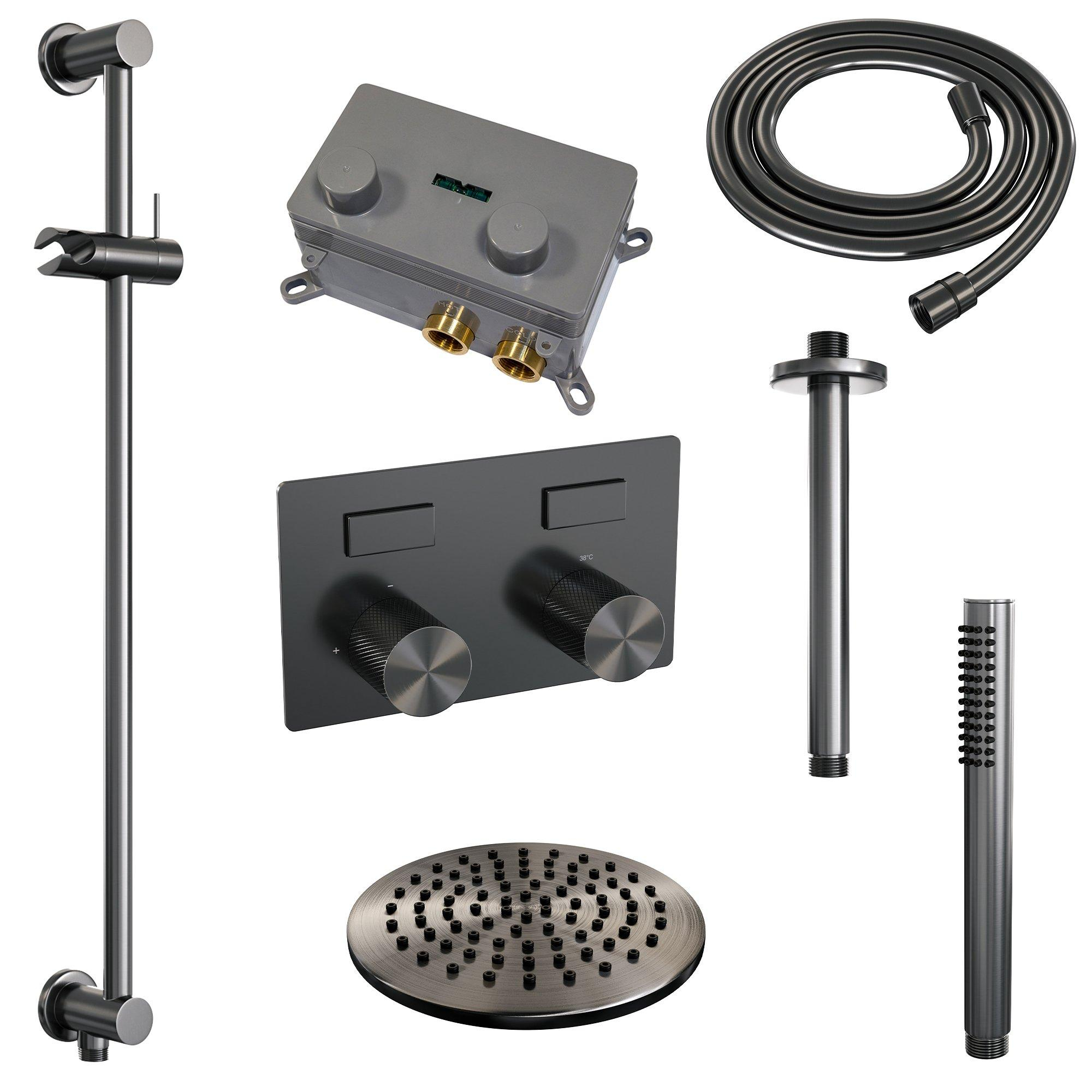 BRAUER gunmetal Carving Thermostatische Regendouche inbouw - drukknoppen - SET 65 - 20cm hoofddouche - plafondarm - staaf handdouche - doucheslang - geïntegreerde glijstang - gunmetal geborsteld PVD