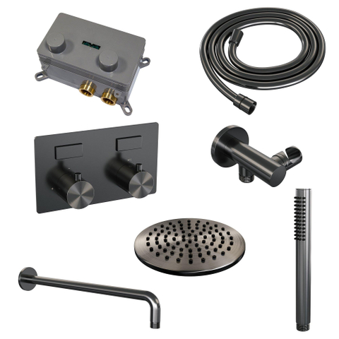 BRAUER gunmetal Edition Thermostatische Regendouche inbouw - drukknoppen - SET 51 - 20cm hoofddouche - gebogen muurarm - staaf handdouche - doucheslang - wandaansluitbocht - gunmetal geborsteld PVD