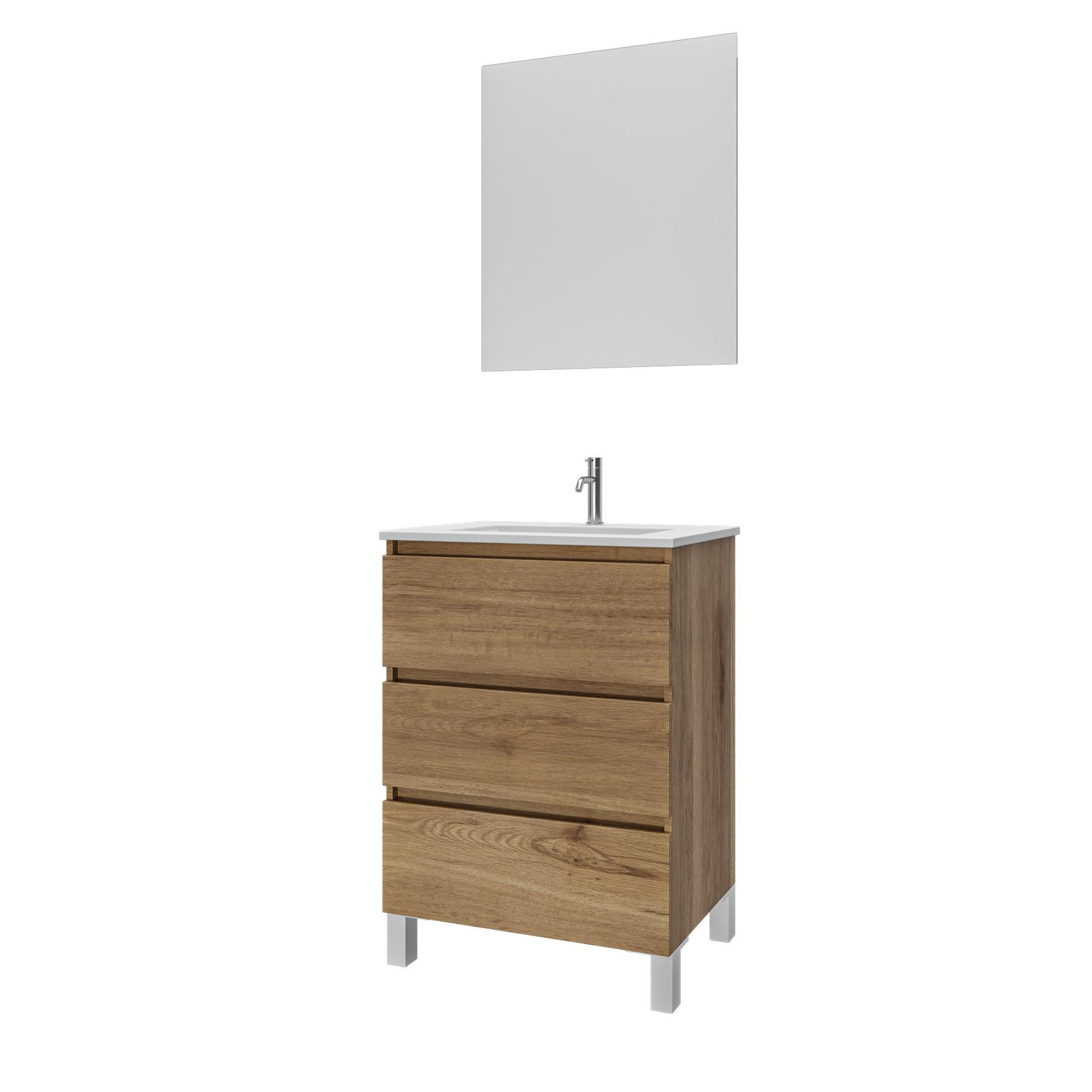 Adema Chaci PLUS Badkamermeubelset - 60x86x46cm - 1 rechthoekige keramische wasbak wit - 1 kraangat - 3 lades - rechthoekige spiegel - eiken
