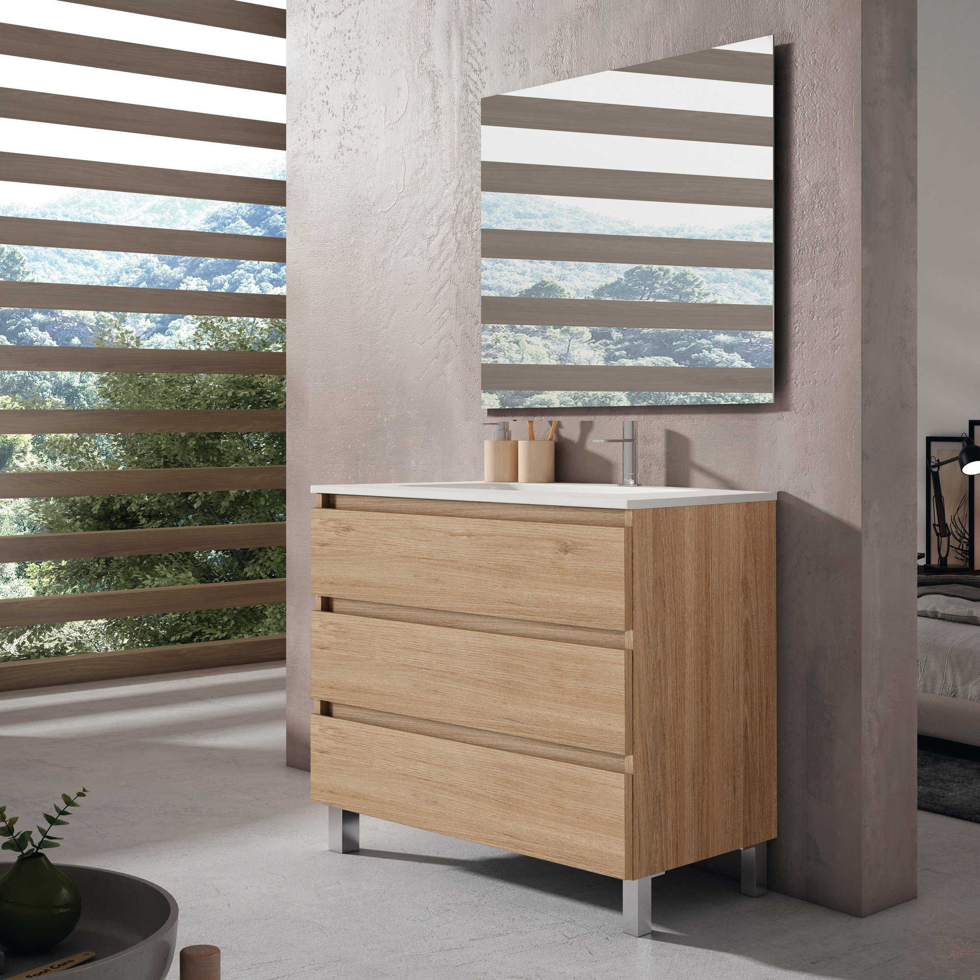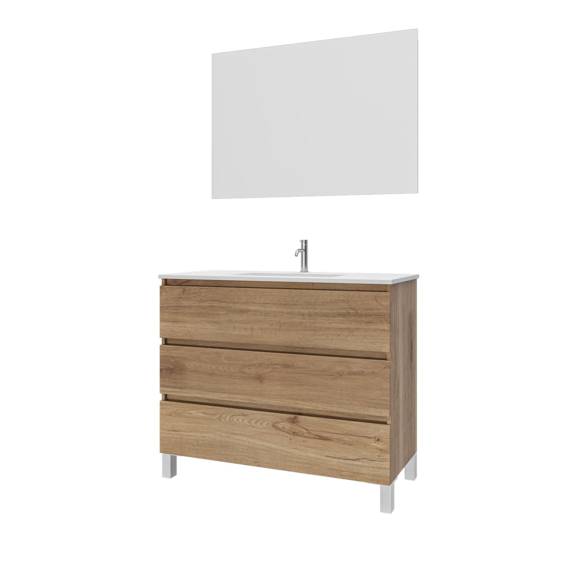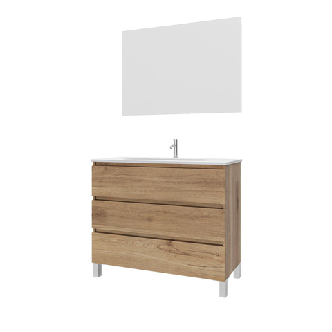 Adema Chaci PLUS Badkamermeubelset - 100x86x46cm - 1 rechthoekige keramische wasbak wit - 1 kraangat - 3 lades - rechthoekige spiegel - eiken