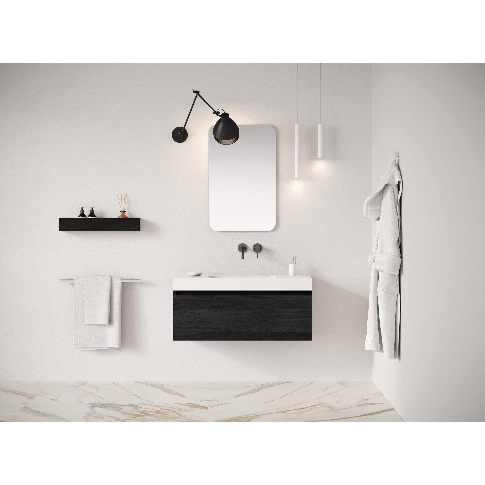 Met 1 lade en een centraal geplaatste wasbak biedt de Looox Solid Wastafelonderkast optimale opbergruimte en gebruiksgemak. De lade is ruim genoeg voor het opbergen van toiletartikelen en handdoeken, terwijl de wasbak perfect is voor dagelijks gebruik. De afvoer in het midden zorgt voor een efficiënte waterafvoer en maakt het schoonmaken eenvoudig. Deze wastafelonderkast combineert functionaliteit met een strak ontwerp.