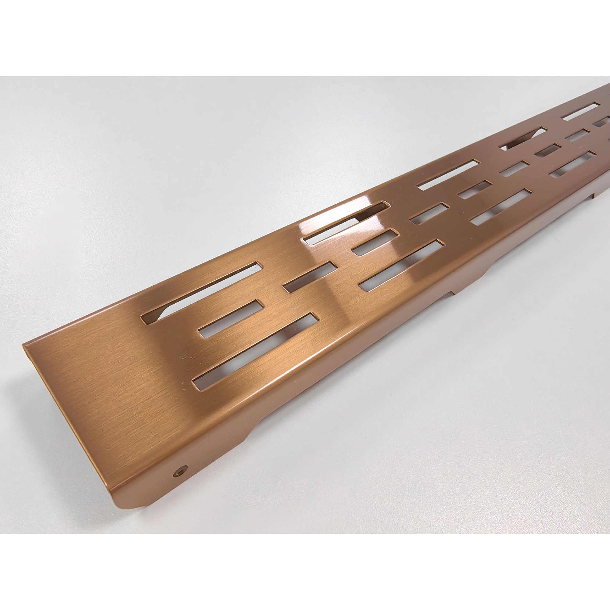 Dit douchegootrooster straalt schoonheid uit met zijn geborsteld koper PVD afwerking. Het glanzende oppervlak voegt een vleugje luxe toe aan je doucheruimte en creëert een warme en uitnodigende sfeer. De gedetailleerde afwerking en het elegante ontwerp maken dit rooster een eyecatcher in je badkamer.