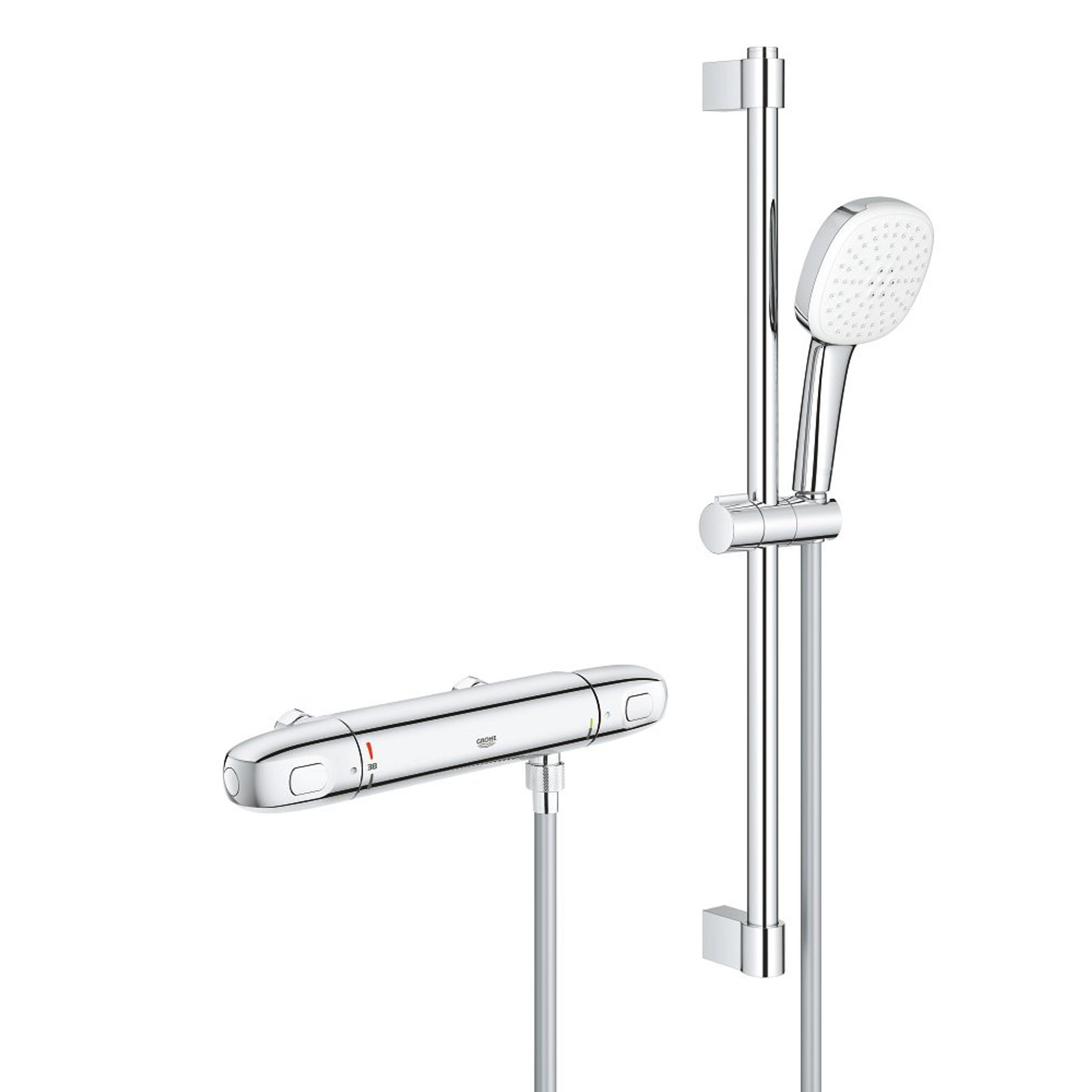 GROHE Grohtherm 1000 Doucheset - thermostatische douchekraan - HOH=12cm - met glijstangset - 60cm - vierkante handdouche - 2 straalsoorten - gladde doucheslang - chroom