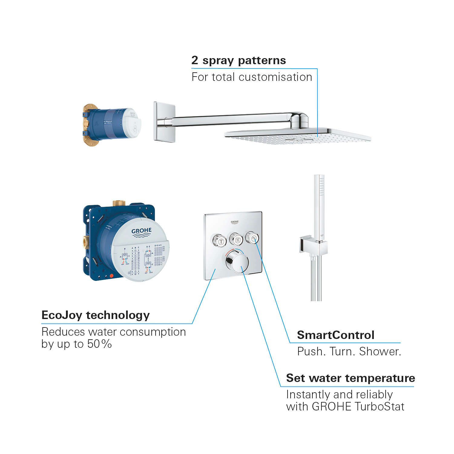 De combisets van GROHE SmartControl zijn gecombineerd met verschillende hand- of hoofddouches waaronder de luxe Rainshower®. Bij de comfortset is er geen glijstang, maar zijn de leidingen onzichtbaar in de muur weggewerkt. De Mono en Duoversies hebben bovendien een tray waarop je shampoo en douchegel kunt plaatsen.