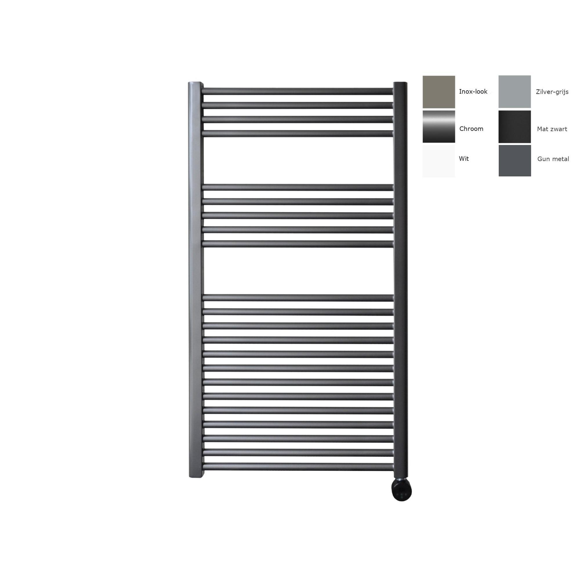 Sanicare electrische design radiator. Stijlvol, makkelijk en milieuvriendelijk is deze Plug & Play Sanicare elektrische design radiator van 111,8 cm hoog en 60 cm breed. Deze radiator is dus reeds afgevuld, voorzien van een overdrukventiel, een digitale thermostaat en is rechtstreeks aan te sluiten op het elektriciteitsnetwerk. De thermostaat is op de rechter verticale buis geplaatst. De radiator bestaat uit buizen met ruime plaats om uw handdoeken op te hangen en ze luxueus warm te maken. Hij produceert een uitstekende warmteafgifte en voorziet u van warme handdoeken in een mum van tijd. De digitale thermostaat heeft de functies aan/uit, temperatuur regeling en uitschakeltimer van 1 – 5 uur. Design radiator 1118 elektrisch is ook milieuvriendelijk! Niet alleen omdat er geen CO2 wordt uitgestoten, maar omdat deze apart te bedienen is. Je hoeft niet de thermostaat van de woonkamer hoger te zetten om de badkamer te verwarmen. Zo verspil je geen kosten en warmte. Dit model radiator is er ook in 172 cm hoog. Ook functioneel en stijlvol zijn de collectie handdoekbeugels en handdoekknoppen (ook handig om een badjas aan op te hangen). Plug & Play Kleur: Gun metal / thermostaat zwart Uitvoering: electrisch Afmeting: 111,8 x 60 cm. Watt: 730 Incl. ophanging, overdruk ventiel, 4 montagebeugels, thermostaat (locatie thermostaat is rechtsonder). Voordelen: alleen een stroompunt nodig, gemakkelijk aan te sluiten, temperatuur exact in te stellen, mileuvriendelijk.
