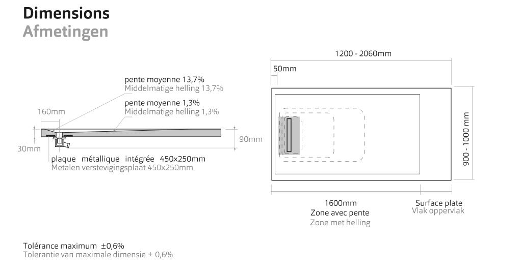 Xenz Soft douchevloer 140x90x3, rvs linear drain, mat wit