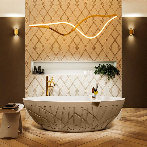 Dit vrijstaande bad straalt stijl en klasse uit. De glanzende afwerking in de kleuren Oro en Talc geeft het bad een tijdloze uitstraling die moeiteloos past bij verschillende badkamerstijlen. De strakke lijnen en het minimalistische design zorgen voor een eigentijdse look die de hele ruimte opwaardeert.