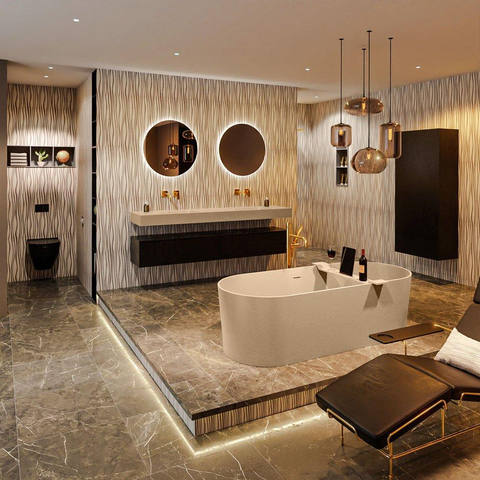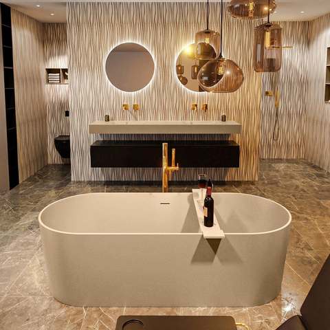 Dit MONDIAZ NOBLE vrijstaande bad straalt pure luxe uit. De gouden afwerking geeft het bad een exclusieve uitstraling die je badkamer transformeert tot een spa-achtige oase van rust. De vloeiende lijnen en het diepe ontwerp zorgen voor een comfortabele en ontspannende badervaring. Dit bad is niet alleen een functioneel element in je badkamer, maar ook een stijlvolle toevoeging die je interieur naar een hoger niveau tilt.