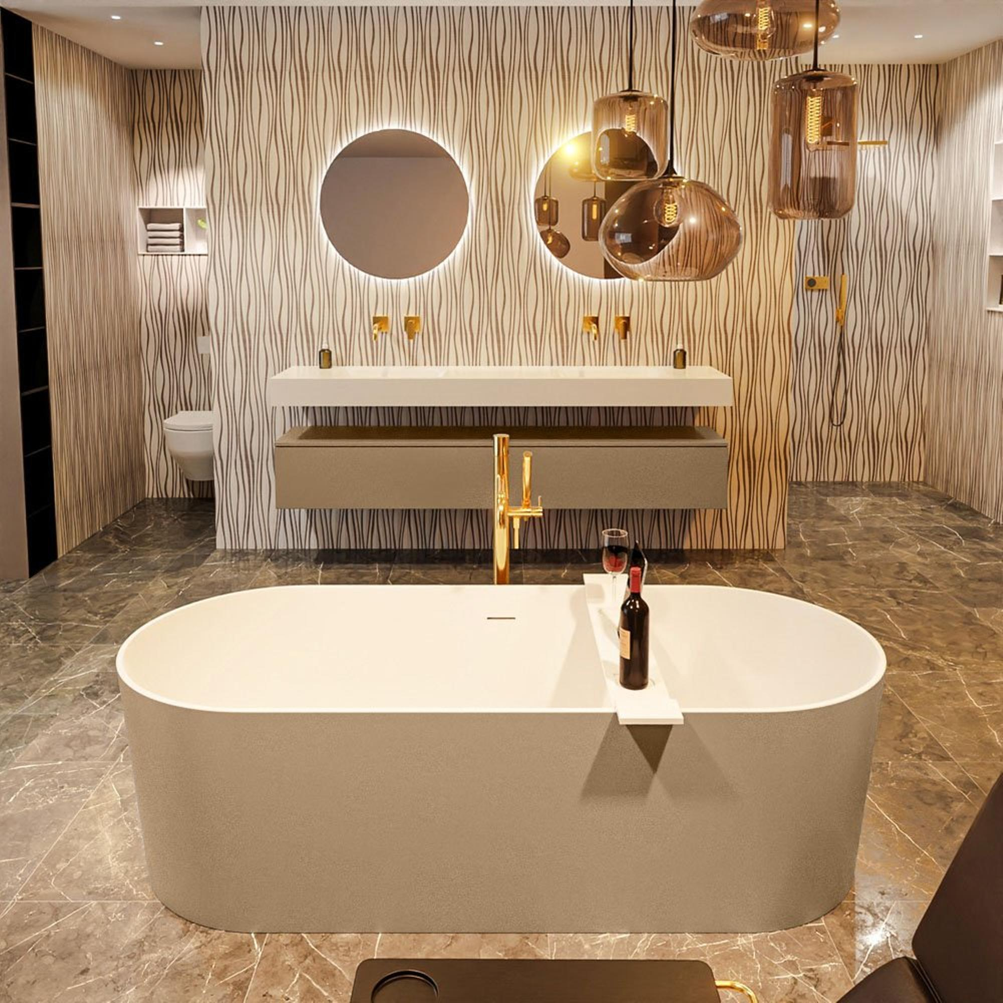 Met zijn slanke en eigentijdse vormgeving is het MONDIAZ NOBLE vrijstaande bad een stijlvolle toevoeging aan elke badkamer. Het strakke ontwerp en de harmonieuze kleurencombinatie van Oro en Talc zorgen voor een verfijnde uitstraling die perfect past bij zowel moderne als klassieke interieurstijlen. Dit bad is niet alleen functioneel, maar ook een kunstwerk op zich dat de badkamer verheft tot een luxe spa-ervaring.