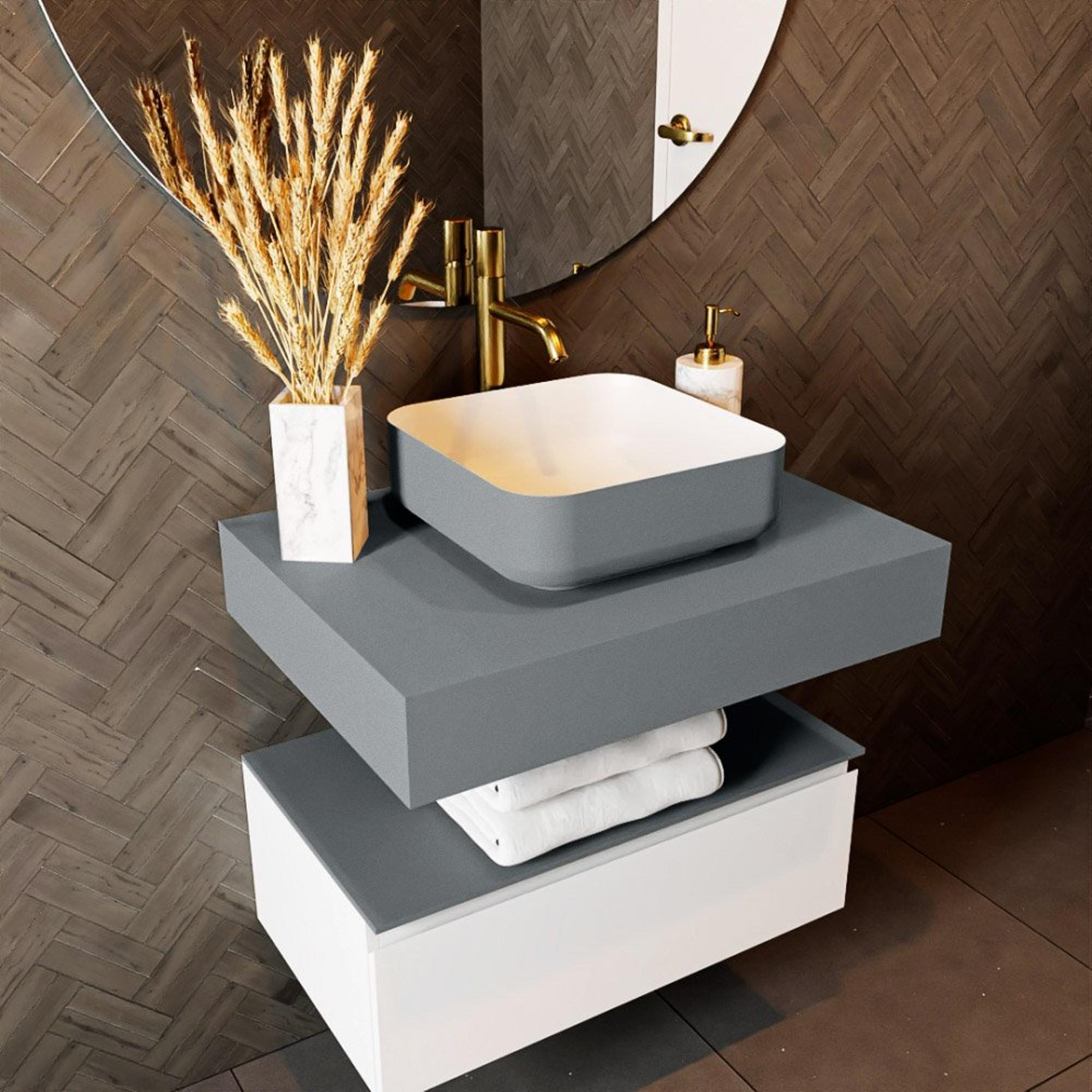 Dit topblad is niet alleen een lust voor het oog, maar ook zeer functioneel. Met een afmeting van 70x51x12cm biedt het voldoende ruimte voor een waskom, waardoor je badkamer een praktische en georganiseerde uitstraling krijgt. Het gebruik van solid surface materiaal garandeert duurzaamheid en eenvoudig onderhoud.