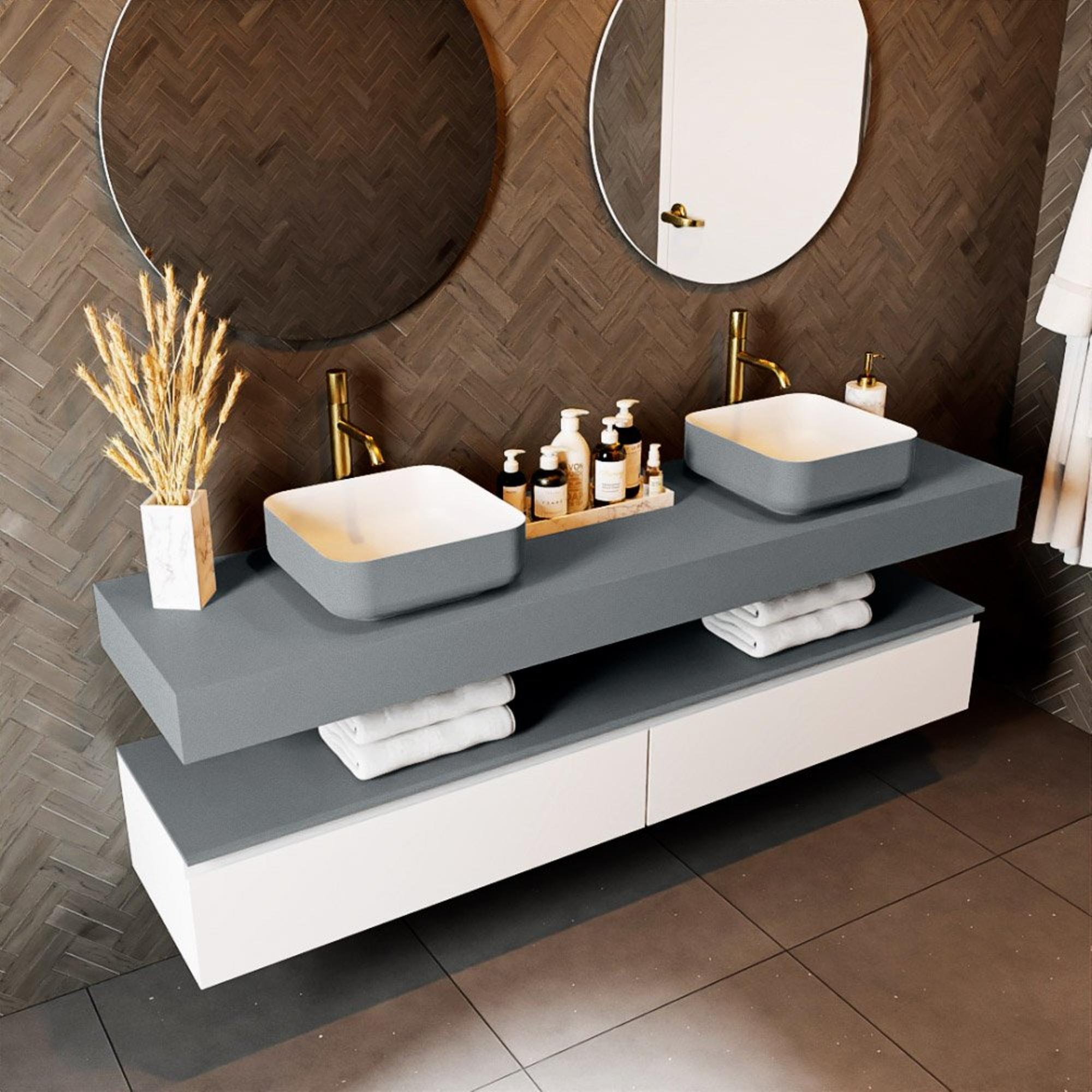 Dit vrijhangende topblad is speciaal ontworpen voor gebruik met een waskom, waardoor het zowel praktisch als esthetisch is. De ruime afmetingen bieden voldoende ruimte voor dagelijks gebruik, terwijl de duurzame materialen zorgen voor een langdurige en onderhoudsvriendelijke oplossing voor jouw badkamerbehoeften.