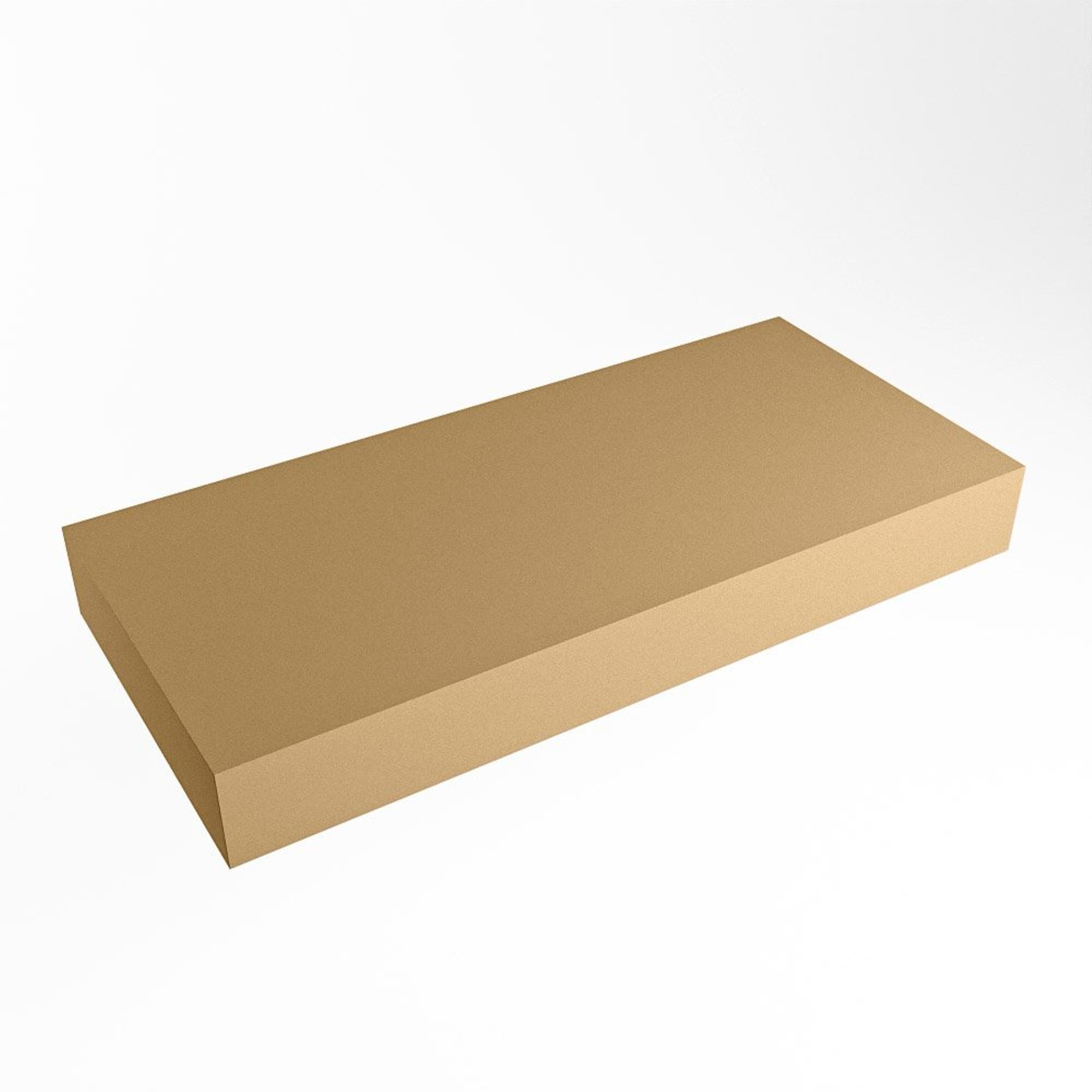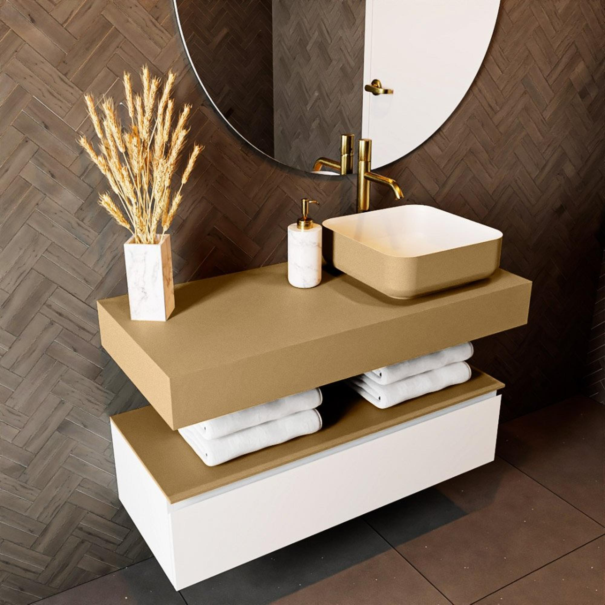 Met zijn slanke en gestroomlijnde ontwerp voegt dit topblad een vleugje elegantie toe aan elke badkamer. De gladde afwerking en de subtiele gouden tint van het solid surface materiaal zorgen voor een tijdloze uitstraling die moeiteloos past bij diverse interieurstijlen.