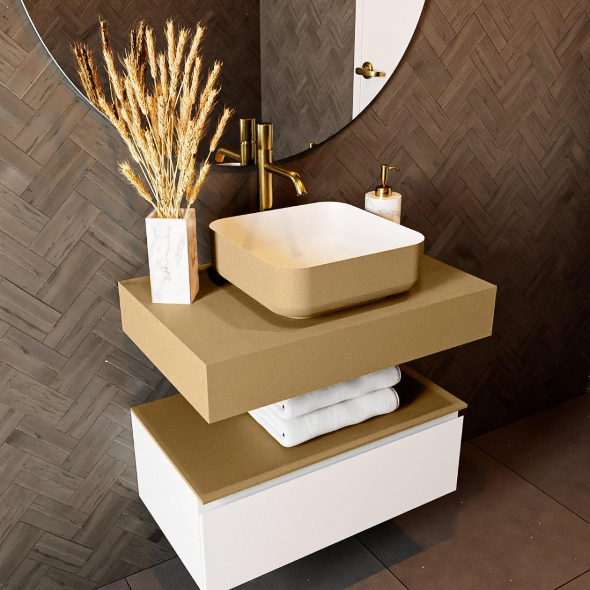 De Mondiaz TOP 46 Vrijhangend Topblad in de kleur Oro straalt pure elegantie uit. De warme gouden tint voegt een vleugje luxe toe aan elke badkamer. Dit topblad is niet alleen een functioneel element, maar ook een stijlvolle toevoeging die de ruimte transformeert tot een oase van rust en schoonheid.