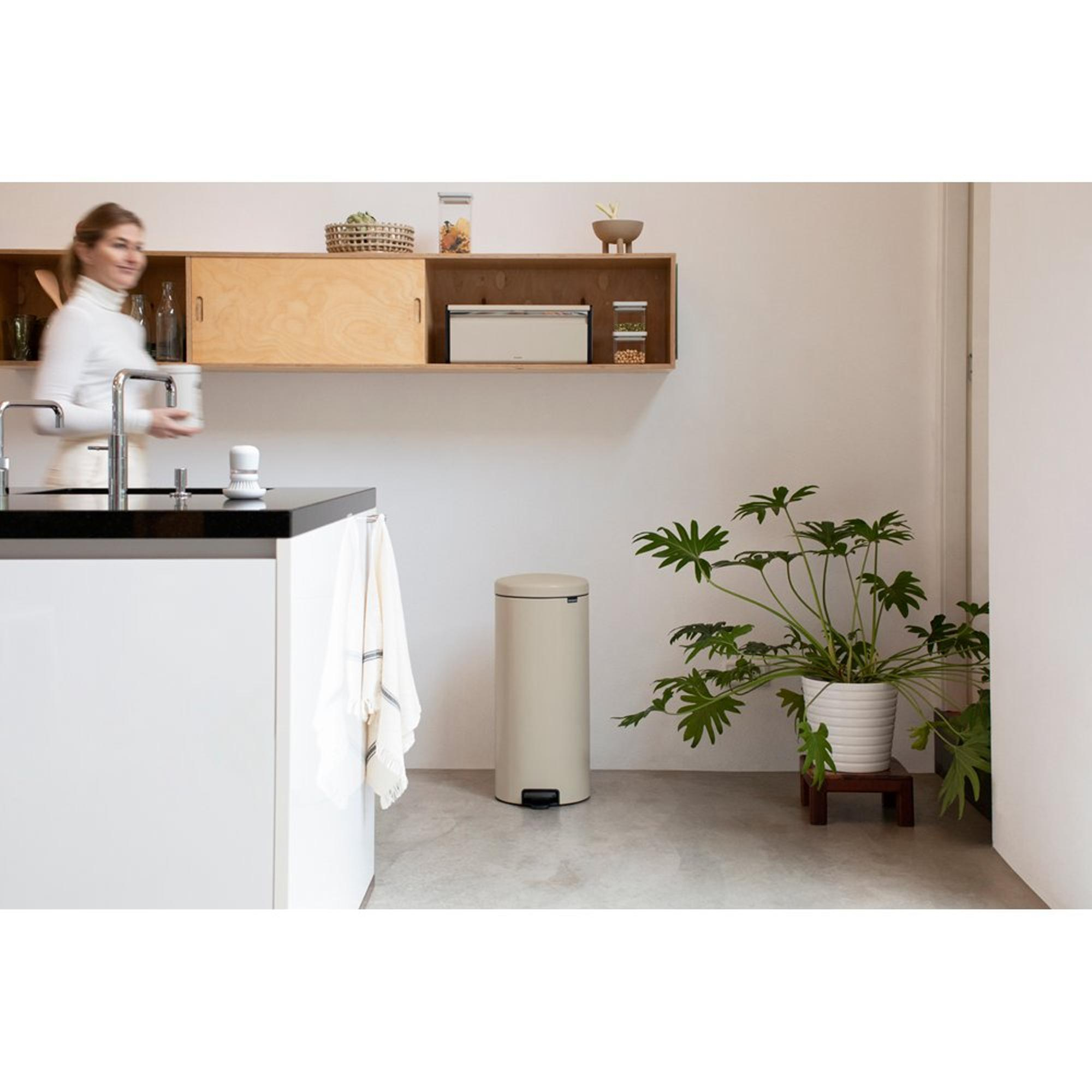 De Brabantia NewIcon Pedaalemmer in soft beige is niet alleen functioneel, maar ook een prachtige toevoeging aan elke badkamer of keuken. Met een inhoud van 30 liter biedt deze pedaalemmer voldoende ruimte voor al je afval. De kunststof binnenemmer zorgt voor eenvoudige reiniging en is duurzaam in gebruik. Het pedaalmechanisme zorgt voor handsfree bediening, waardoor hygiëne en gemak hand in hand gaan. De soft beige kleur geeft een stijlvolle en warme uitstraling aan de ruimte, waardoor deze pedaalemmer niet alleen praktisch is, maar ook een esthetisch element vormt.