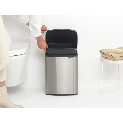 De Brabantia Bo Afvalemmer straalt stijl en klasse uit met zijn matte stalen afwerking. De vingerafdrukbestendige coating zorgt ervoor dat de prullenbak altijd zijn elegante uitstraling behoudt, zelfs bij veelvuldig gebruik. Het tijdloze ontwerp past moeiteloos in elke badkamer- of keukeninrichting, waardoor het een veelzijdige en chique toevoeging is aan je huis.