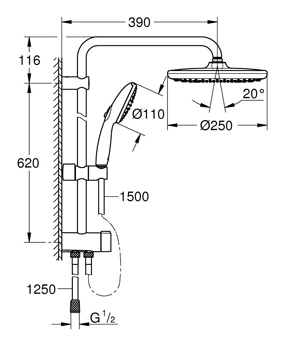 Dit Vitalio Start 250 Flex douchesysteem is de eenvoudige manier om je douche-ervaring en het uiterlijk van je badkamer volledig te veranderen. Het opbouwsysteem voor wandmontage bestaat uit een hoofddouche van 250 mm, een handdouche van 110 mm, een omstelling om eenvoudig te kunnen wisselen tussen hoofd- en handdouche of de 2 straalsoorten van de hoofddouche, een douchestang met douchearm van 390 mm en glijstuk om de handdouche te verstellen, plus twee doucheslangen van 1500 mm en 1250 mm. De hoofddouche biedt een ontspannende Rain Spray, of een SmartRain Spray die hetzelfde comfortniveau biedt, maar met een gereduceerd watervolume. De handdouche is uitgerust met een ShockProof siliconen ring om hem te beschermen tegen vallen of stoten. De handdouche heeft 2 straalsoorten: de zachte Rain Spray en de krachtige, gerichte Jet Spray. Beide douchestralen zijn eenvoudig te bedienen via de innovatieve GROHE SmartSwitch draaiknop aan de achterkant van de douchekop. En de GROHE Water Saving doorstroombegrenzer vermindert het waterverbruik aanzienlijk zonder in te leveren op prestaties. GROHE DreamSpray zorgt ervoor dat de waterstraal uit elke sproeigaatje gelijk is, zodat je zo comfortabel en plezierig mogelijk kunt douchen. De SpeedClean siliconen sproeigaatjes zijn zo ontworpen dat je ze met een simpele veeg van kalkaanslag kunt ontdoen. De duurzame en onderhoudsvriendelijke GROHE Long-Life Finish zorgt ervoor dat het douchesysteem er een leven lang onberispelijk blijft uitzien. En dankzij de flexibele installatie en eenvoudige aansluiting is dit systeem compatibel met de mengkraan in je bestaande douche, zodat je je douche in een handomdraai kunt upgraden. bestaat uit: