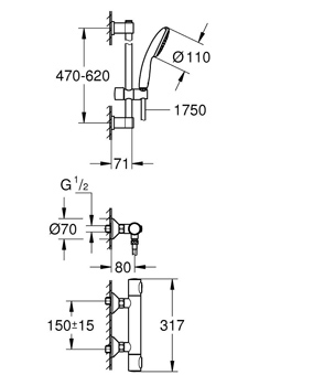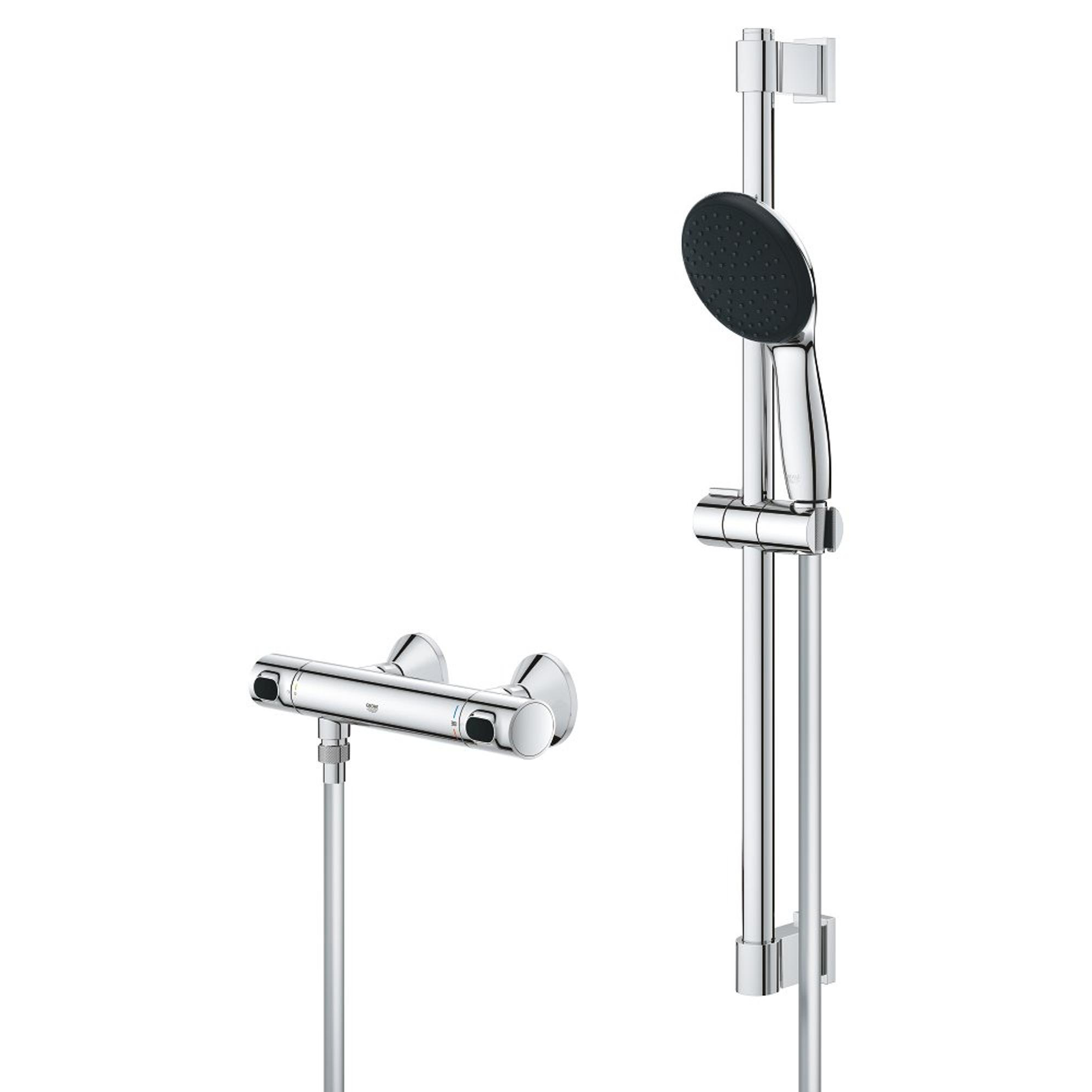 Geniet elke dag van geavanceerde douchetechnologie met de GROHE Precision Flow doucheset. De set bevat de GROHE Precision Flow thermostatische douchemengkraan, een Vitalio Start 110 handdouche, een douchestang van 600 mm en een doucheslang van 1750 mm. De GROHE thermostaattechnologie van de kraan zorgt voor een constante toevoer van water op de perfecte temperatuur, zonder onaangename temperatuurschommelingen. De GROHE Water Saving functie vermindert het water- en energieverbruik – perfect in combinatie met de handdouche. Hij is ook gezinsvriendelijk dankzij de GROHE SafeStop knop die is ingesteld op 38°C, zodat kinderen niet per ongeluk de watertemperatuur te hoog kunnen zetten. En voor nog meer beveiliging kun je de optionele GROHE SafeStop Plus temperatuurbegrenzer instellen op 43°C. Mocht de koudwatertoevoer volledig uitvallen, dan zorgt een automatische veiligheidsstop ervoor dat de watertoevoer tot een minimum wordt beperkt. De handdouche van 110 mm heeft een rustgevende Rain Spray die je omhult met een zachte, maar constante douchestraal. De GROHE DreamSpray technologie stemt de waterstraal van elk sproeigaatje op elkaar af voor een gelijkmatige douchestraal. De douchekop werkt ook waterbesparend dankzij de debietbegrenzer, die het waterverbruik aanzienlijk vermindert zonder in te leveren op de prestaties. Een minimale druk van 1,0 bar wordt aanbevolen. Dankzij GROHE SpeedClean kun je met je vinger de sproeigaatjes eenvoudig ontdoen van kalkaanslag. De ShockProof siliconen ring beschermt de handdouche én de douchebak of badkuip tegen schade als je hem per ongeluk laat vallen. De stevige doucheslang kan tegen een stootje en is bestand tegen een waterdruk tot 5 bar, een spanning tot 50 kg en een temperatuur tot 70°C. De douchestang wordt geleverd met een glijstuk en een draaibare houder, zodat het aanpassen van de hoogte en de hoek van de douche heel eenvoudig is. De bovenste montagebeugel is ook in hoogte verstelbaar, wat betekent dat hij op bestaande boorgaten kan worden gemonteerd. En dankzij de schitterende maar slijtvaste GROHE Long-Life Finish blijft deze set er jarenlang onberispelijk uitzien. Je hebt geen gereedschap nodig voor de installatie – dankzij het QuickFix-principe is de installatie "surprisingly easy". Met de GROHE QuickSpanner kan de thermostaatkraan zonder extra gereedschap gemonteerd worden. De douchestang kan worden vastgeschroefd of – nog gemakkelijker – eenvoudig worden vastgelijmd! Het enige wat je daarvoor nodig hebt zijn 2 stuks van de GROHE QuickGlue Set S (41247000, apart verkrijgbaar). De draagkracht is max. 20 kg. Als je extra hulp nodig hebt, bekijk dan onze QuickVideo of raadpleeg de QuickGuide. met glijstangset 1 straal (Rain)