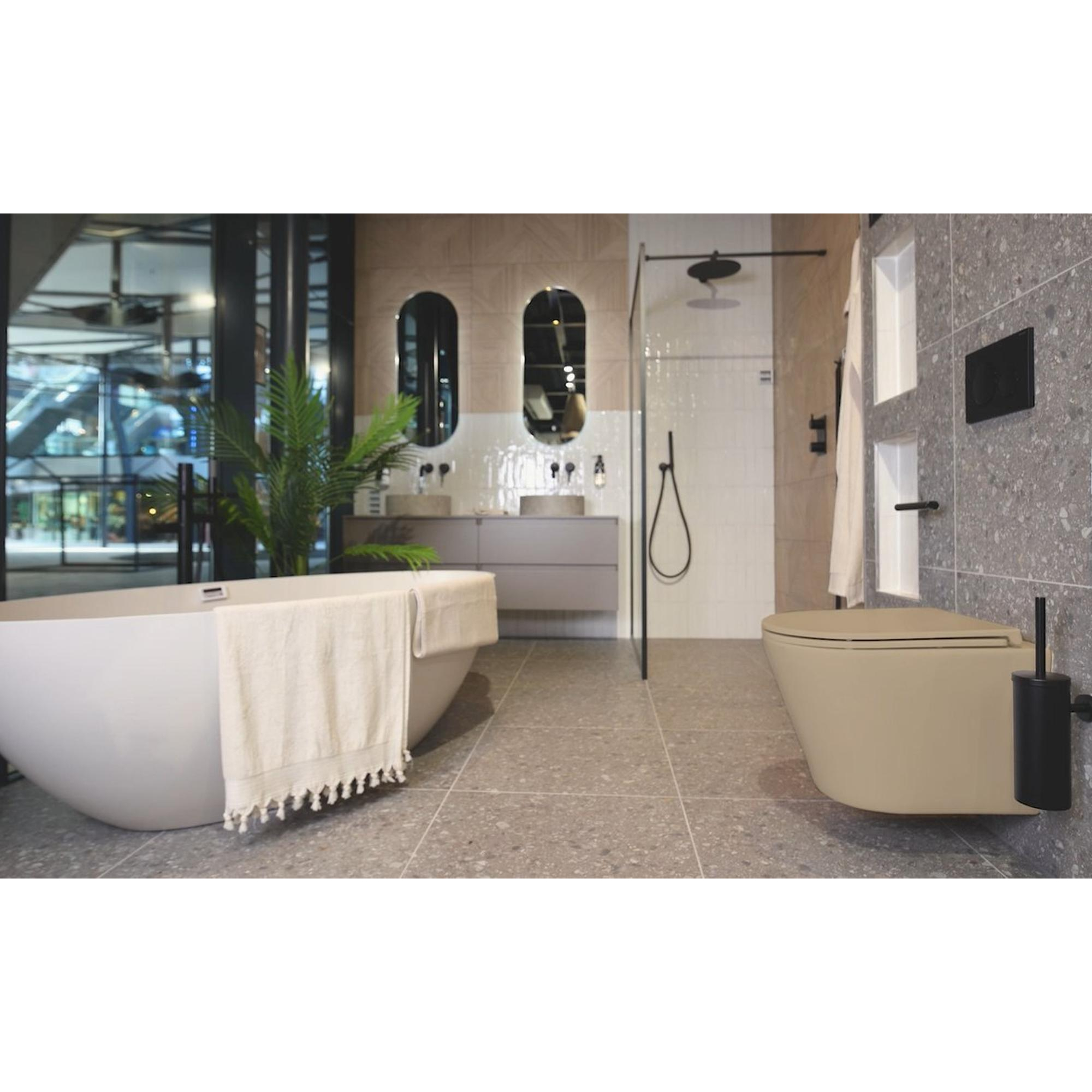 De QeramiQ Dely Wandclosetset straalt elegantie uit met zijn gestroomlijnde vorm en subtiele beige tint. Het minimalistische ontwerp past perfect bij zowel traditionele als moderne badkamers, waardoor het een veelzijdige keuze is voor elk interieur. Deze set tilt de uitstraling van je badkamer naar een hoger niveau en creëert een sfeer van luxe en comfort.