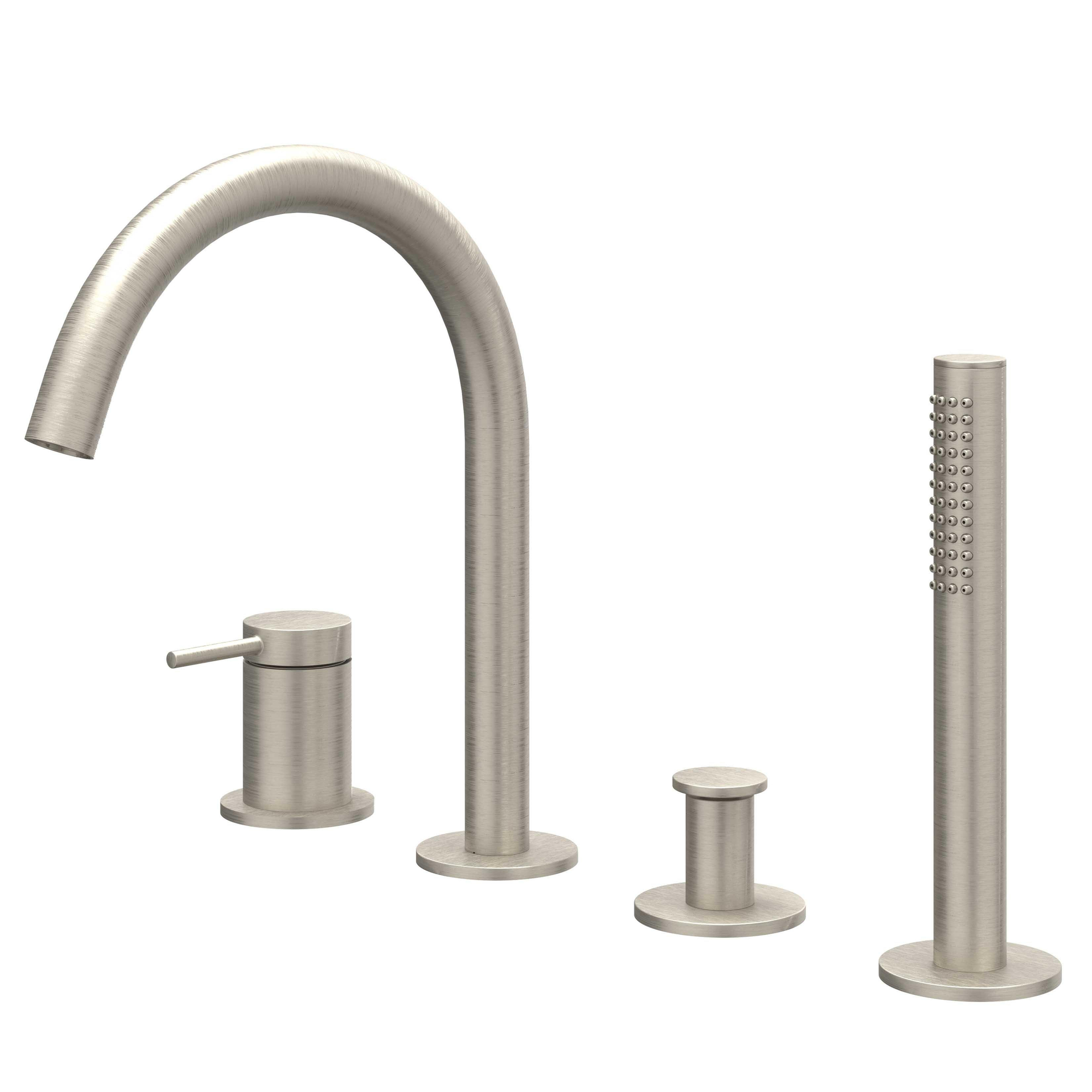 De IVY Bond Badrandcombinatie 4-gats mengkraan met draaibare uitloop en uittrekbare handdouche in geborsteld nikkel PVD is een prachtige toevoeging aan elke badkamer. Met zijn elegante ontwerp en hoogwaardige afwerking straalt dit product luxe en stijl uit. Het combineert functionaliteit met esthetiek, waardoor het niet alleen een essentieel onderdeel van de badkamer is, maar ook een decoratief element dat de ruimte verfraait.