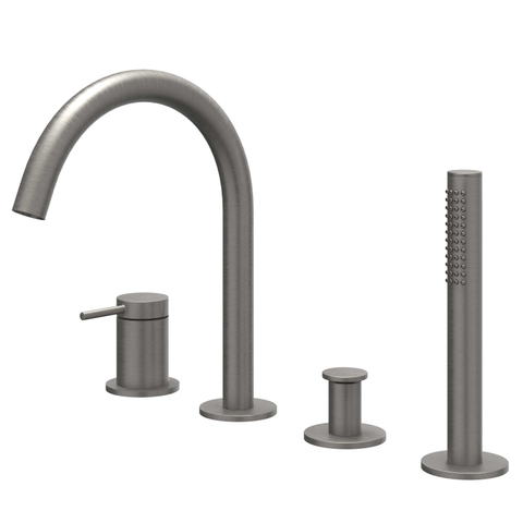 De IVY Bond Badrandcombinatie 4-gats mengkraan met draaibare uitloop en uittrekbare handdouche in Geborsteld Metal Black PVD is een prachtige toevoeging aan elke badkamer. Met zijn elegante ontwerp en hoogwaardige afwerking straalt dit product luxe en stijl uit. Het combineert functionaliteit met esthetiek, waardoor het niet alleen een praktische keuze is, maar ook een visueel aantrekkelijke aanwinst voor je badkamer.
