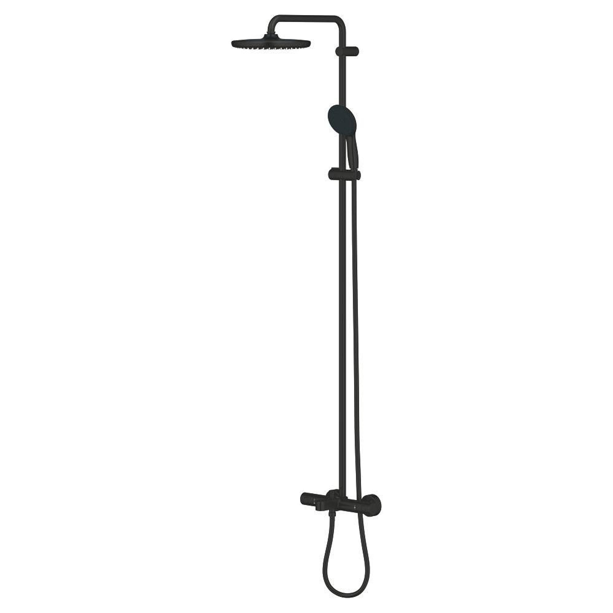 Het GROHE Tempesta 250 thermostatische douchesysteem voor badkuipen in Matte Black (mat zwart) zit boordevol slimme technologie en heeft een verbluffende vormgeving die elke badkamer verfraait