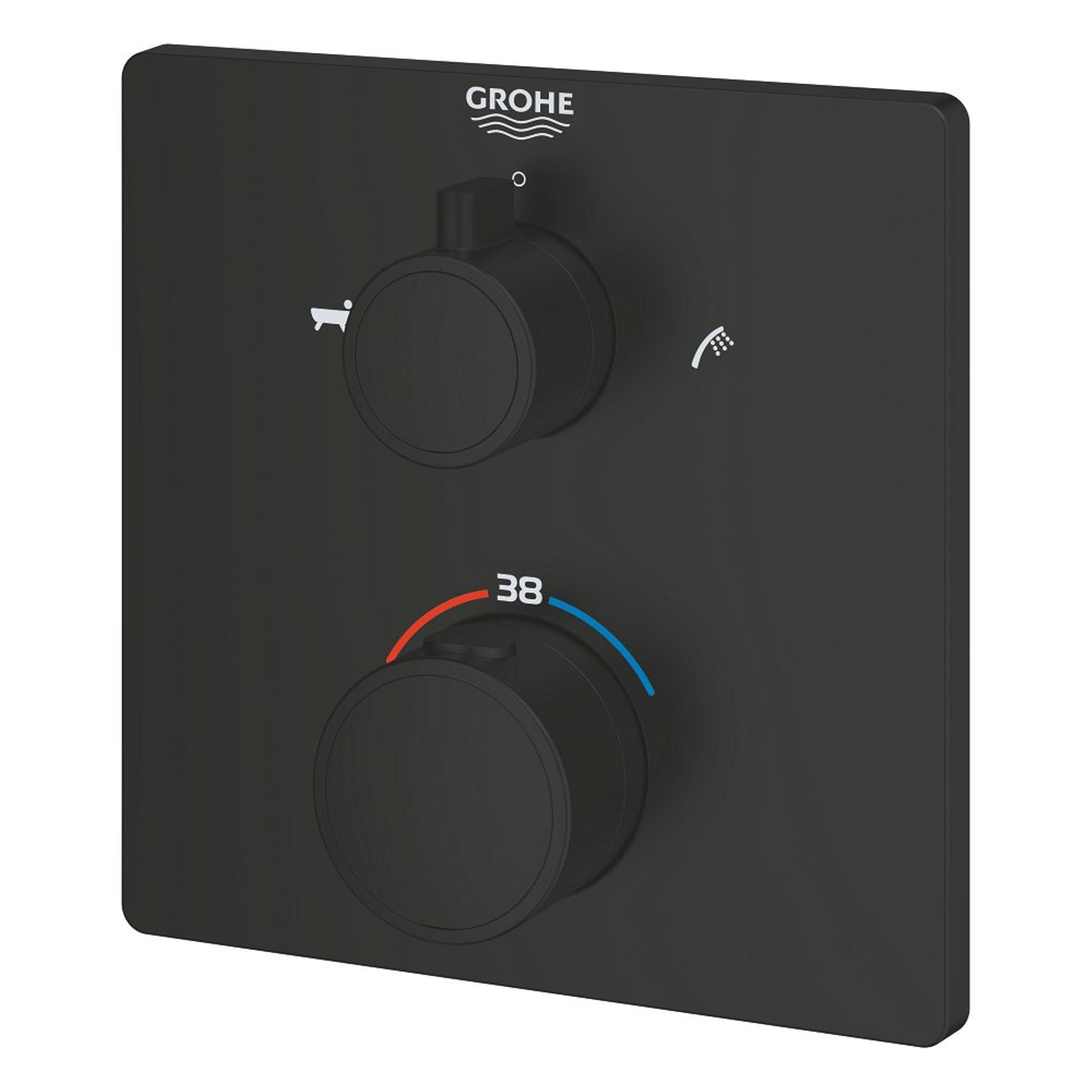 De GROHE Grohtherm thermostatische badmengkraan in opvallend Matte Black (mat zwart) – intuïtieve bediening voor je douche en bad in een stijlvol, vierkant ontwerp