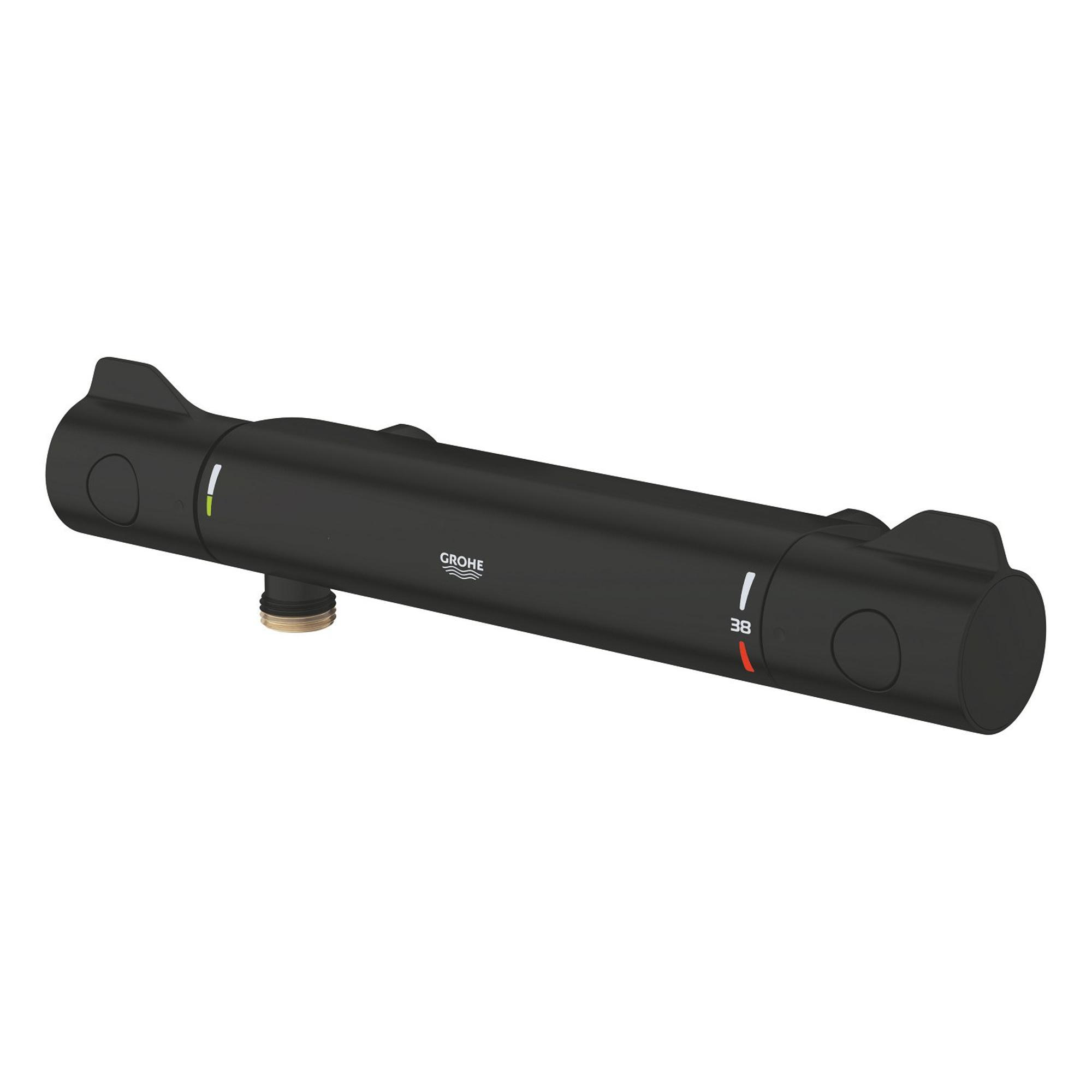 De GROHE Grohtherm 800 douchethermostaat in Matte Black (mat zwart) – nauwkeurige temperatuurregeling en een verbluffende look Ervaar de voordelen van een thermostaatkraan tegen een aantrekkelijke prijs. Afgewerkt in sprankelend GROHE StarLight® chroom, profiteert Grohtherm 800 van GROHE TurboStat® technologie die zorgt voor een constante temperatuur. De SafeStop button, ingesteld op 38ºC, voorkomt dat kinderen de temperatuur boven de 38ºC draaien, terwijl de EcoButton je in staat stelt om het waterverbruik te verminderen. De ergonomische grepen bieden je een goede grip te allen tijde, zelfs met natte of ingezeepte handen. De Grohtherm 800 is beschikbaar als douche- en badthermostaatkraan.