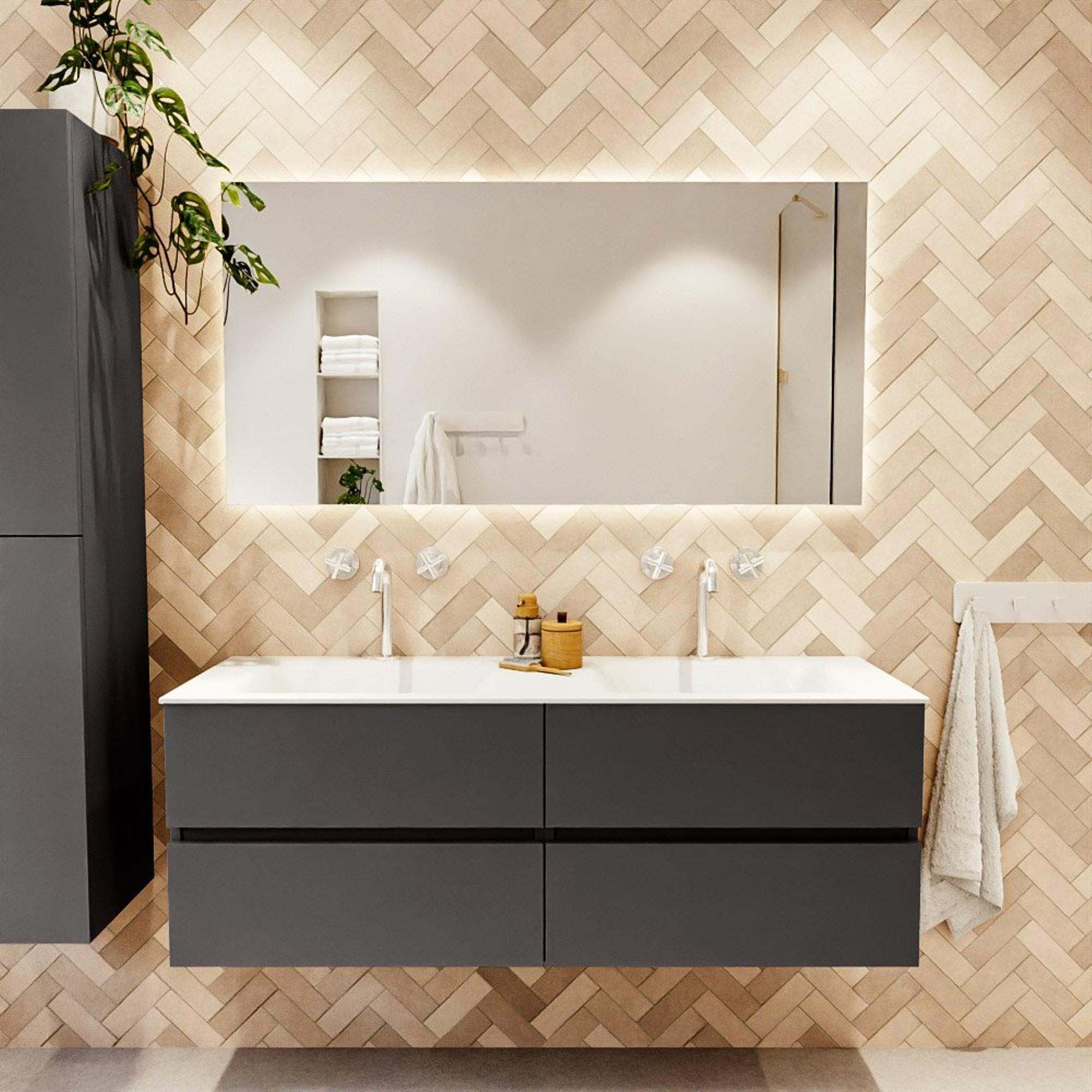 MONDIAZ VICA Badkamermeubelset - 140cm - onderkast dark grey - 4 lades - wastafel cloud dubbel - 2 kraangaten - 60cm hoge versie - talc