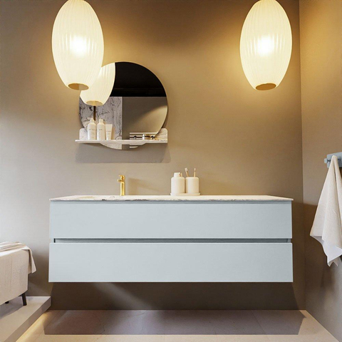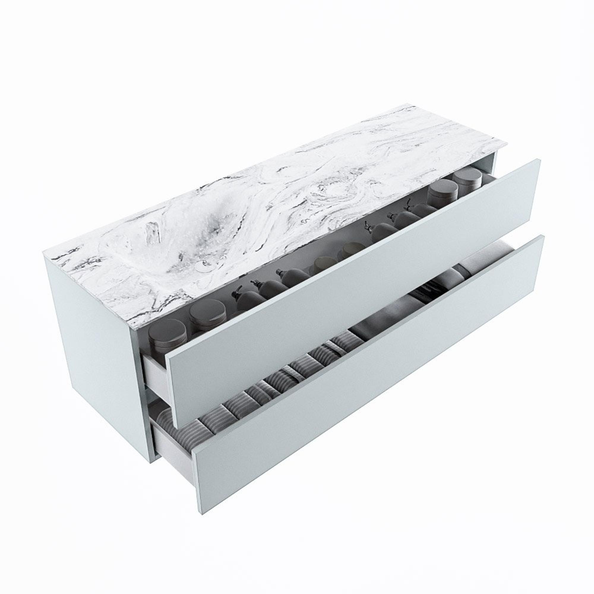 De buitengewone mooie badmeubel set VICA DLUX is een schitterend pronkstuk in uw badkamer. De gemarmerde Solid surface wastafel van CORIAN heeft een fraaie en tijdloze uitstraling. Door de zachte en natuurlijke vorm van de wastafel, gecombineerd met de tijdloze en prachtige badmeubel onderkast past de VICA-DLUX goed bij de diverse stijlen badkamers. Om uw badkamer compleet te af te stijlen hebben wij ook de nissen en spiegelhouders in dezelfde kleur als de wastafel. Zoals de Mondiaz nissen en spiegel planchetten. De serie VICA DLUX bestaat uit de 2 of 4 laden onderkast VICA gecombineerd met een CORIAN Solid surface wastafel met marmer structuur. De Solid surface CORIAN wastafel is in 5 marmer looks verkrijgbaar. Met deze badkamermeubel set heeft u wel die mooie marmeren uitstraling maar tevens ook het gemak en de hygiëne van Solid surface. Let op: U ziet bij de XL (60cm) variant de afbeeldingen/video's van de standaard hoogte (50cm)
