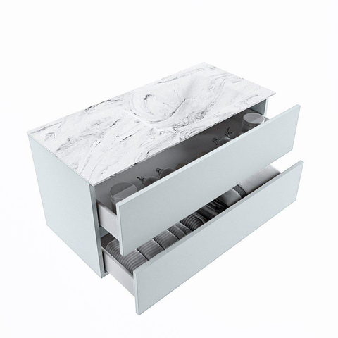 De buitengewone mooie badmeubel set VICA DLUX is een schitterend pronkstuk in uw badkamer. De gemarmerde Solid surface wastafel van CORIAN heeft een fraaie en tijdloze uitstraling. Door de zachte en natuurlijke vorm van de wastafel, gecombineerd met de tijdloze en prachtige badmeubel onderkast past de VICA-DLUX goed bij de diverse stijlen badkamers. Om uw badkamer compleet te af te stijlen hebben wij ook de nissen en spiegelhouders in dezelfde kleur als de wastafel. Zoals de Mondiaz nissen en spiegel planchetten. De serie VICA DLUX bestaat uit de 2 of 4 laden onderkast VICA gecombineerd met een CORIAN Solid surface wastafel met marmer structuur. De Solid surface CORIAN wastafel is in 5 marmer looks verkrijgbaar. Met deze badkamermeubel set heeft u wel die mooie marmeren uitstraling maar tevens ook het gemak en de hygiëne van Solid surface. Let op: U ziet bij de XL (60cm) variant de afbeeldingen/video's van de standaard hoogte (50cm)