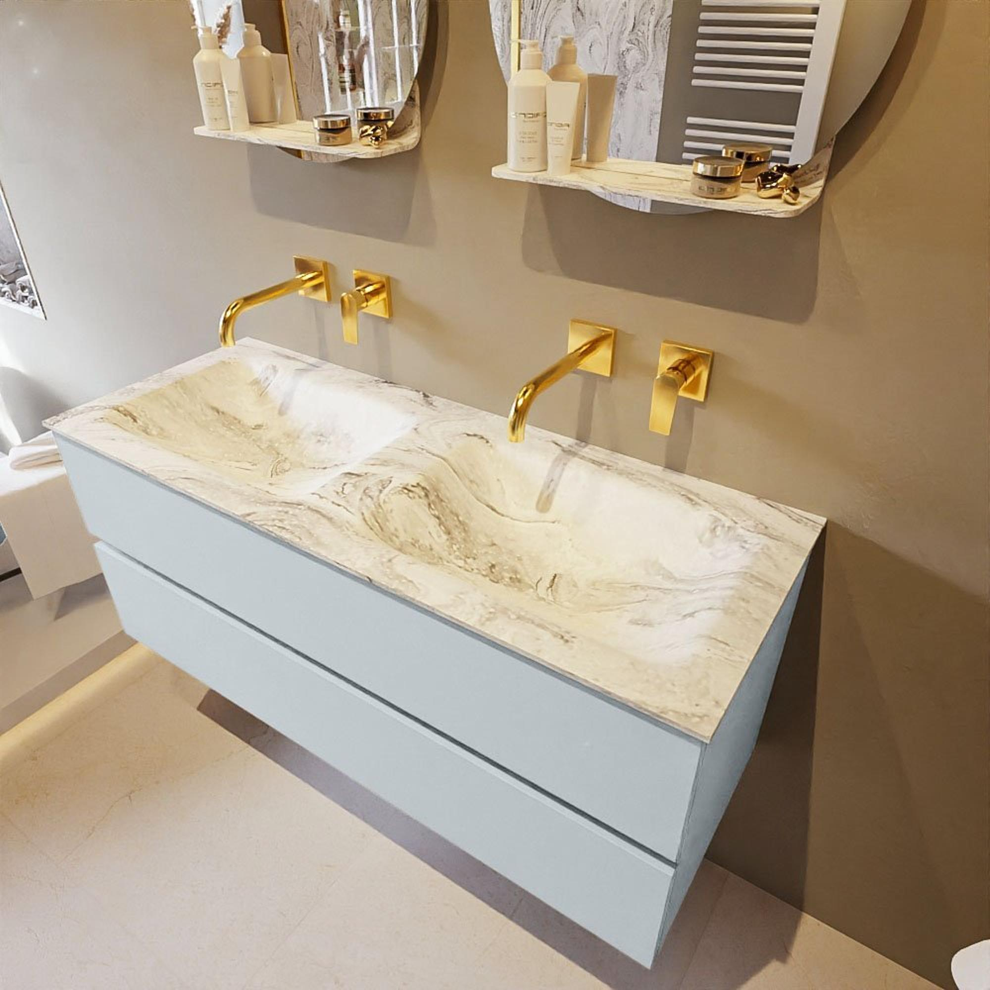 MONDIAZ VICA-DLUX Badkamermeubelset - 120cm - onderkast clay- 2 lades - inbouw wastafel cloud dubbel - zonder kraangaten - 60cm hoge versie - glace
