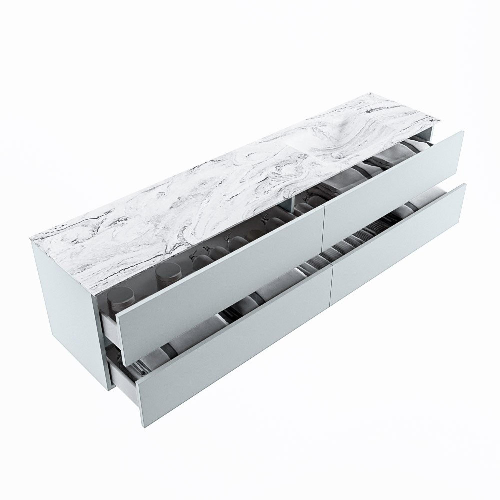 De buitengewone mooie badmeubel set VICA DLUX is een schitterend pronkstuk in uw badkamer. De gemarmerde Solid surface wastafel van CORIAN heeft een fraaie en tijdloze uitstraling. Door de zachte en natuurlijke vorm van de wastafel, gecombineerd met de tijdloze en prachtige badmeubel onderkast past de VICA-DLUX goed bij de diverse stijlen badkamers. Om uw badkamer compleet te af te stijlen hebben wij ook de nissen en spiegelhouders in dezelfde kleur als de wastafel. Zoals de Mondiaz nissen en spiegel planchetten. De serie VICA DLUX bestaat uit de 2 of 4 laden onderkast VICA gecombineerd met een CORIAN Solid surface wastafel met marmer structuur. De Solid surface CORIAN wastafel is in 5 marmer looks verkrijgbaar. Met deze badkamermeubel set heeft u wel die mooie marmeren uitstraling maar tevens ook het gemak en de hygiëne van Solid surface. Let op: U ziet bij de XL (60cm) variant de afbeeldingen/video's van de standaard hoogte (50cm)