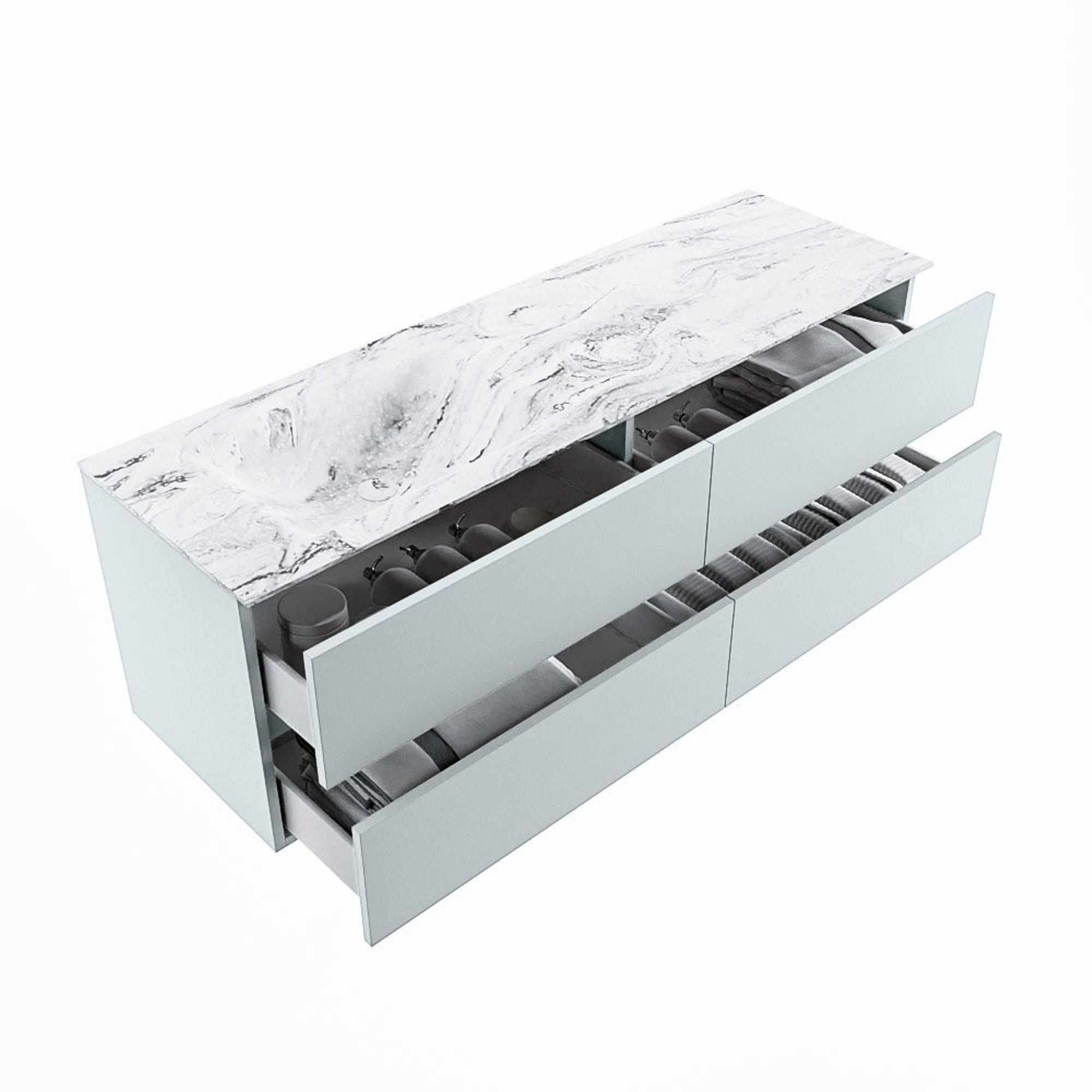 De buitengewone mooie badmeubel set VICA DLUX is een schitterend pronkstuk in uw badkamer. De gemarmerde Solid surface wastafel van CORIAN heeft een fraaie en tijdloze uitstraling. Door de zachte en natuurlijke vorm van de wastafel, gecombineerd met de tijdloze en prachtige badmeubel onderkast past de VICA-DLUX goed bij de diverse stijlen badkamers. Om uw badkamer compleet te af te stijlen hebben wij ook de nissen en spiegelhouders in dezelfde kleur als de wastafel. Zoals de Mondiaz nissen en spiegel planchetten. De serie VICA DLUX bestaat uit de 2 of 4 laden onderkast VICA gecombineerd met een CORIAN Solid surface wastafel met marmer structuur. De Solid surface CORIAN wastafel is in 5 marmer looks verkrijgbaar. Met deze badkamermeubel set heeft u wel die mooie marmeren uitstraling maar tevens ook het gemak en de hygiëne van Solid surface. Let op: U ziet bij de XL (60cm) variant de afbeeldingen/video's van de standaard hoogte (50cm)