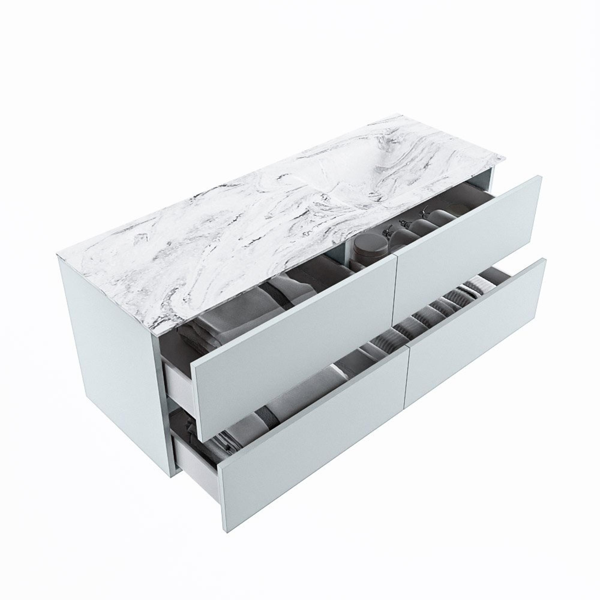 De buitengewone mooie badmeubel set VICA DLUX is een schitterend pronkstuk in uw badkamer. De gemarmerde Solid surface wastafel van CORIAN heeft een fraaie en tijdloze uitstraling. Door de zachte en natuurlijke vorm van de wastafel, gecombineerd met de tijdloze en prachtige badmeubel onderkast past de VICA-DLUX goed bij de diverse stijlen badkamers. Om uw badkamer compleet te af te stijlen hebben wij ook de nissen en spiegelhouders in dezelfde kleur als de wastafel. Zoals de Mondiaz nissen en spiegel planchetten. De serie VICA DLUX bestaat uit de 2 of 4 laden onderkast VICA gecombineerd met een CORIAN Solid surface wastafel met marmer structuur. De Solid surface CORIAN wastafel is in 5 marmer looks verkrijgbaar. Met deze badkamermeubel set heeft u wel die mooie marmeren uitstraling maar tevens ook het gemak en de hygiëne van Solid surface. Let op: U ziet bij de XL (60cm) variant de afbeeldingen/video's van de standaard hoogte (50cm)