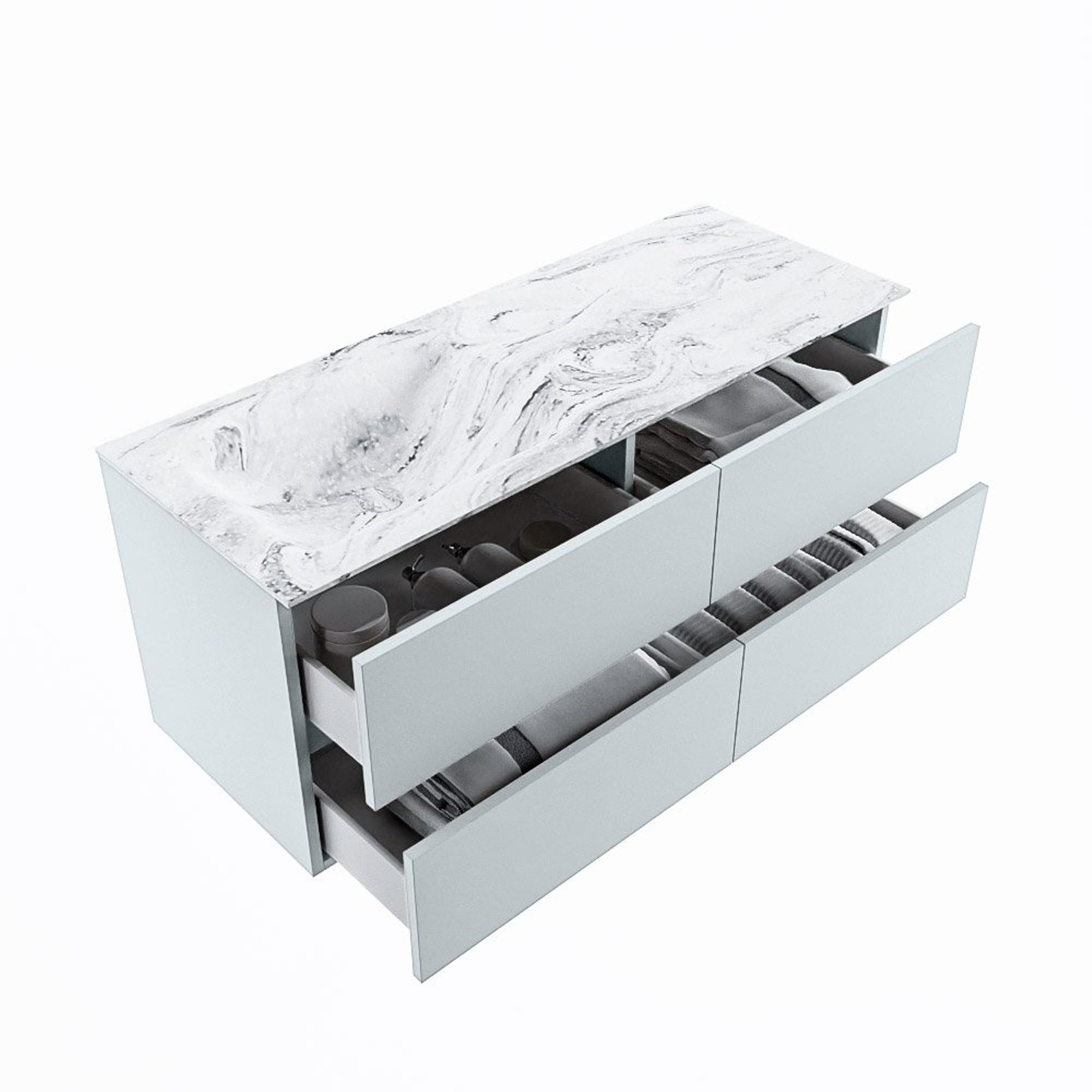 De buitengewone mooie badmeubel set VICA DLUX is een schitterend pronkstuk in uw badkamer. De gemarmerde Solid surface wastafel van CORIAN heeft een fraaie en tijdloze uitstraling. Door de zachte en natuurlijke vorm van de wastafel, gecombineerd met de tijdloze en prachtige badmeubel onderkast past de VICA-DLUX goed bij de diverse stijlen badkamers. Om uw badkamer compleet te af te stijlen hebben wij ook de nissen en spiegelhouders in dezelfde kleur als de wastafel. Zoals de Mondiaz nissen en spiegel planchetten. De serie VICA DLUX bestaat uit de 2 of 4 laden onderkast VICA gecombineerd met een CORIAN Solid surface wastafel met marmer structuur. De Solid surface CORIAN wastafel is in 5 marmer looks verkrijgbaar. Met deze badkamermeubel set heeft u wel die mooie marmeren uitstraling maar tevens ook het gemak en de hygiëne van Solid surface. Let op: U ziet bij de XL (60cm) variant de afbeeldingen/video's van de standaard hoogte (50cm)